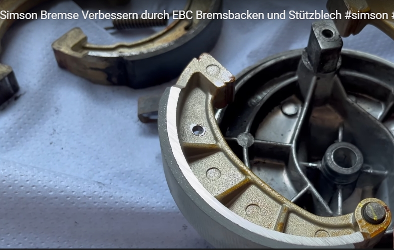 Übrigens, mit EBC Backen wäre ich vorsichtig, bei der Ostoase sind in den Bewertungen einige Backenbrüche zu finden. Ich finde, so etwas darf so gut wie nie vorkommen. Ich tippe darauf, dass dies daran liegt, dass die Bremsbeläge über die gesamte Backe gehen (wie in meiner vereinfachten Skizze) und dass das Alu etwas brüchig ist. Ich stell mir vor, dass wenn der Bremsbelag nahe des Drehpunktes zuerst anliegt, eine zu starke Hebelwirkung auf die Backe wirkt. Alle anderen Backen die ich kenne haben den Bremsbelag nur über den mittleren Bereich, gut zu vergleichen im Screenshot aus einem Video bei Youtube, da liegt eine klassische Backe im Hintergrund. Ich würde bei EBC Backen den Bereich beim Drehpunkt wie bei den anderen üblich freifeilen. -