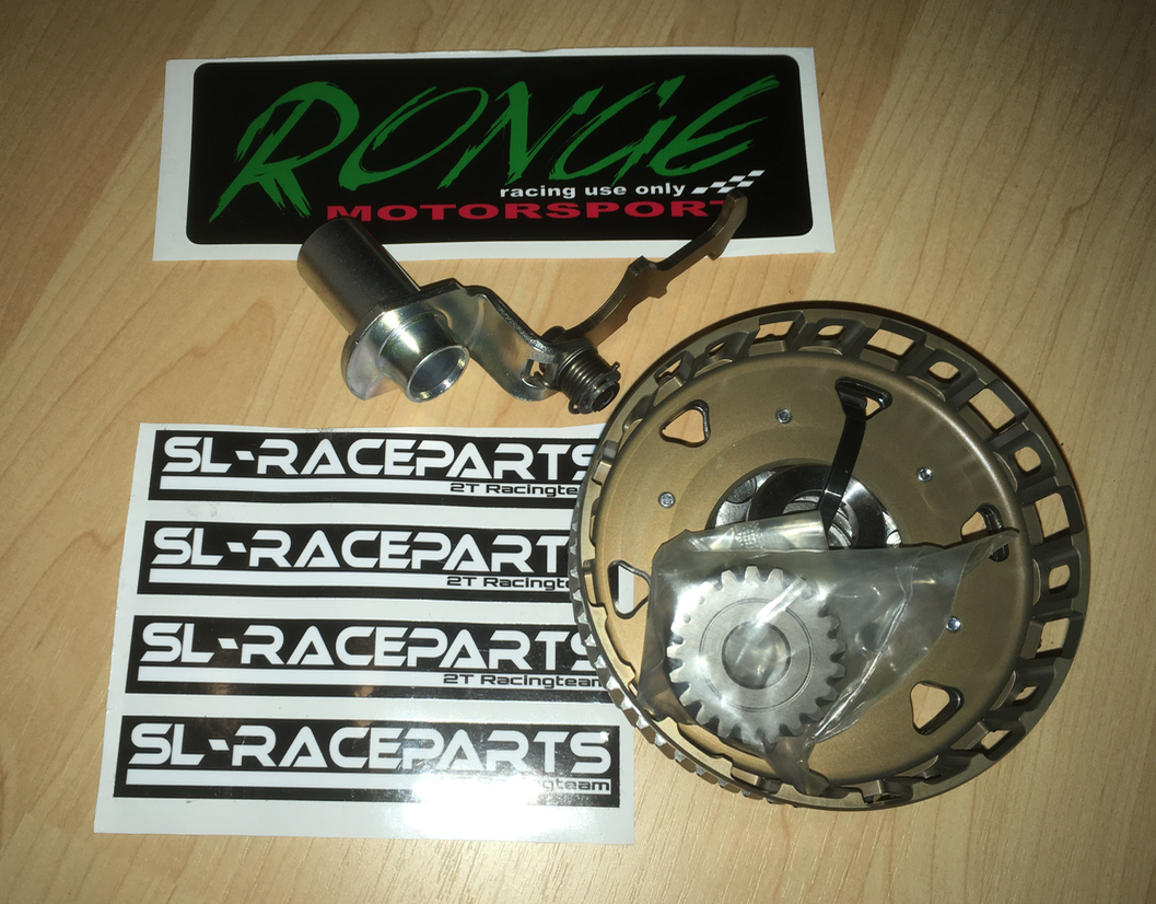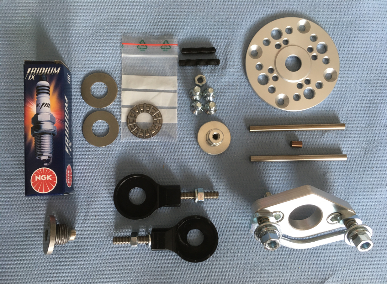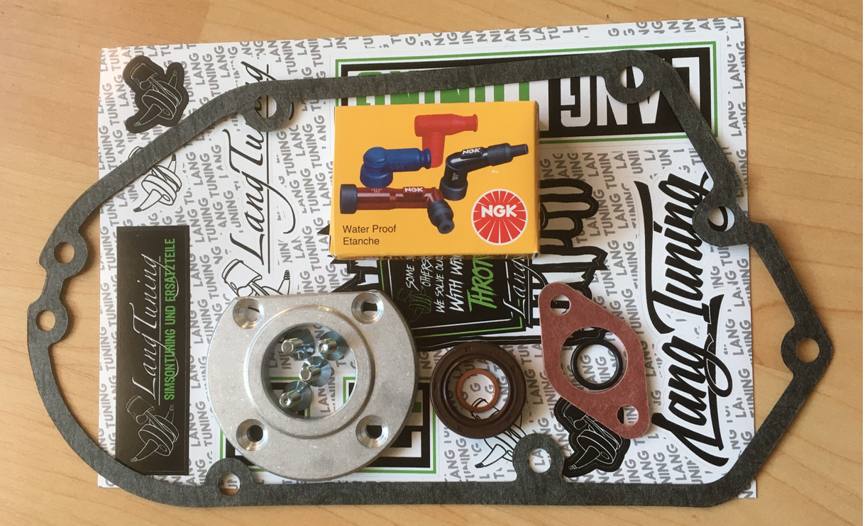 Vor kurzem gab es ein paar Kleinteile von SaMo: Racing-Druckplatte inkl. Silberstahl-Kupplungsdruckstifte, schwarze Kettenspanner und `ne Iridiumkerze.