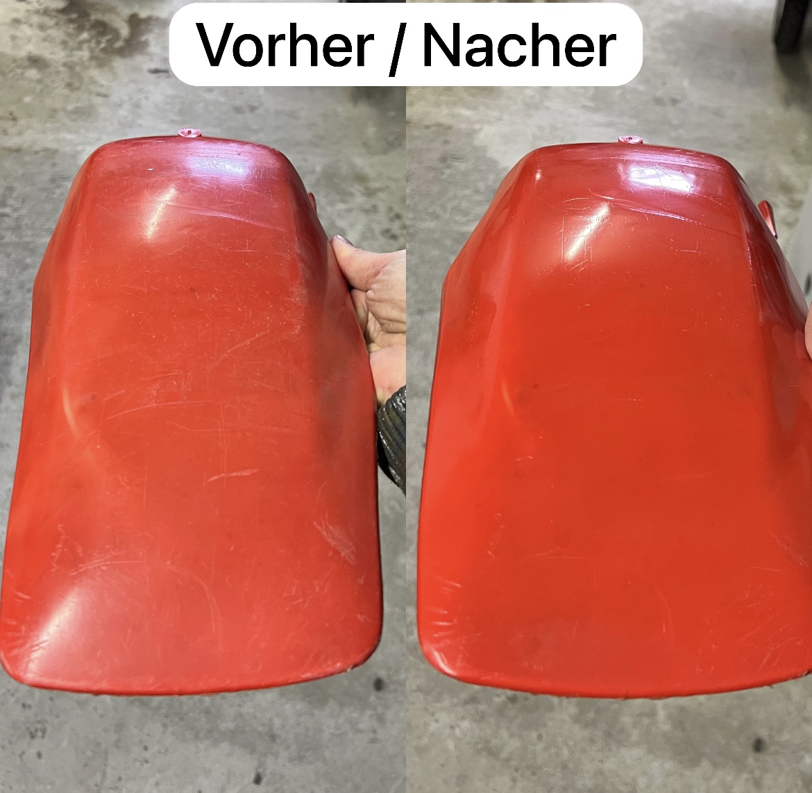 Grundsätzlich kann man sagen, dass der Heißluft-Trick ziemlich gut funktioniert gegen verblichene Kunststoff-Teile. Man föhnt die Teile und kurz bevor sie schmelzen kommen die Weichmacher und die Farbe wieder zurück, siehe Foto. Ist natürlich mit Vorsicht zu geniessen. Beim Tank hat das aber nicht funktioniert, hier wird z.B. ein Trick beschrieben, den Kunsstoff mit einer Rasierklinke zu bearbeiten. Danach sollte eigentlich geschmirgelt werden (zb 1000er Nass usw. gegen kleinere Kratzer) habe ich aber nicht gemacht (sieht man auch), weil ich direkt zum polieren übergegangen bin. Zum Schluss noch eine Wachsversiegelung und so eine Art Silikonspray für die Optik.