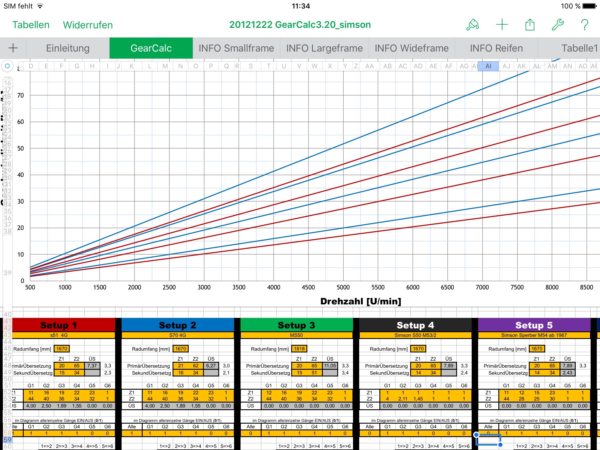 Den Getrieberechner ausm Scooterforum auf Simson und MZ250 umgestrickt, um irgendwann mal unter Zuhilfenahme eines Leistungsdiagramms Ganganschluss Vorhersagen zu können. S51 gegen S70 und MM250/3 gegen MM250/4. Die Tabelle kann ich nicht weitergeben, da sie nicht von mir ist.