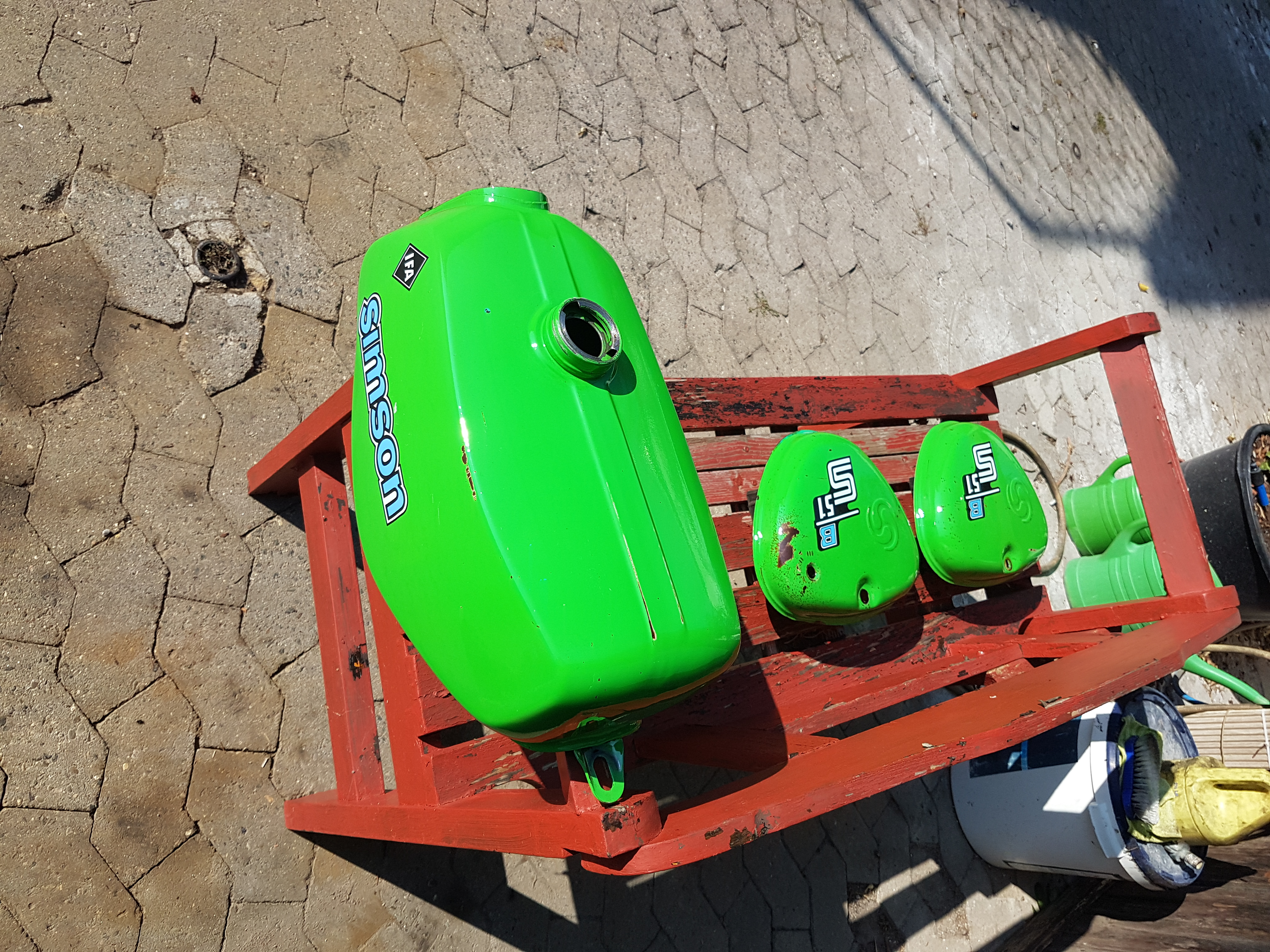 Spraymax 2k aus der Dose hab ich als Lack verwendet. Fürn Dosenlack hab ich damit schon öfter nachhaltig super Ergebnisse erziehlt. Die 3 Staubpickelchen auf der Oberseite des Tanks hab ich mit 3000er Nasschleifpapier entfernt und danach die angeschliffen Oberfläche mit 3M Fastcut Compound (Eine Schleifpolitur) poliert.