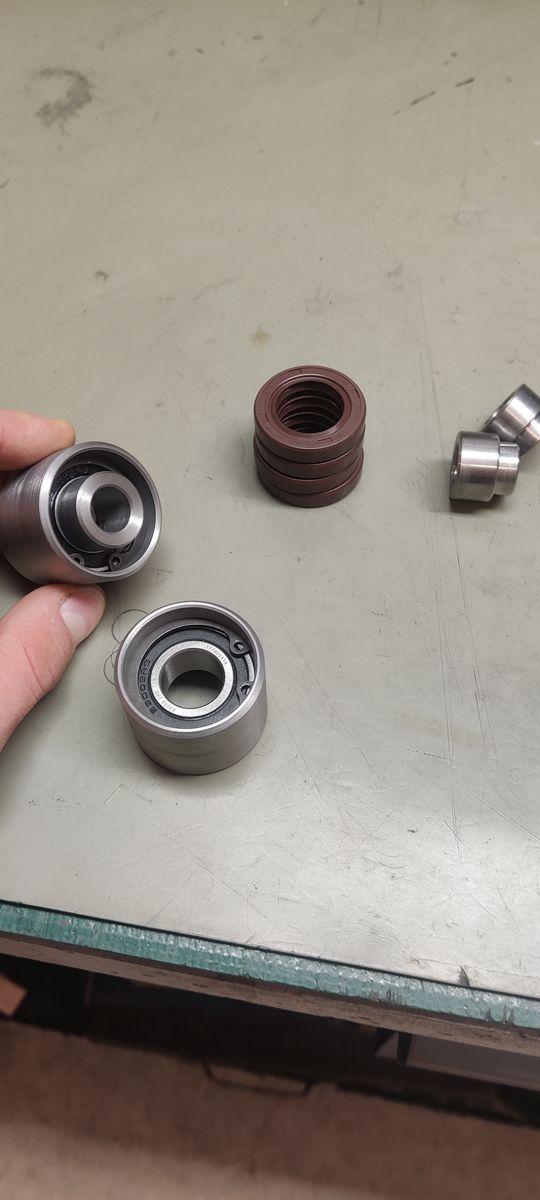 Zum Einsatz kommen hier jeweils ein 63003 2RS Lager, beidseitig gehalten durch 35x1,5 Sicherungsringe und pro Lagerauge zwei Kupplungsdeckelsimmerringe (22x35x7).
