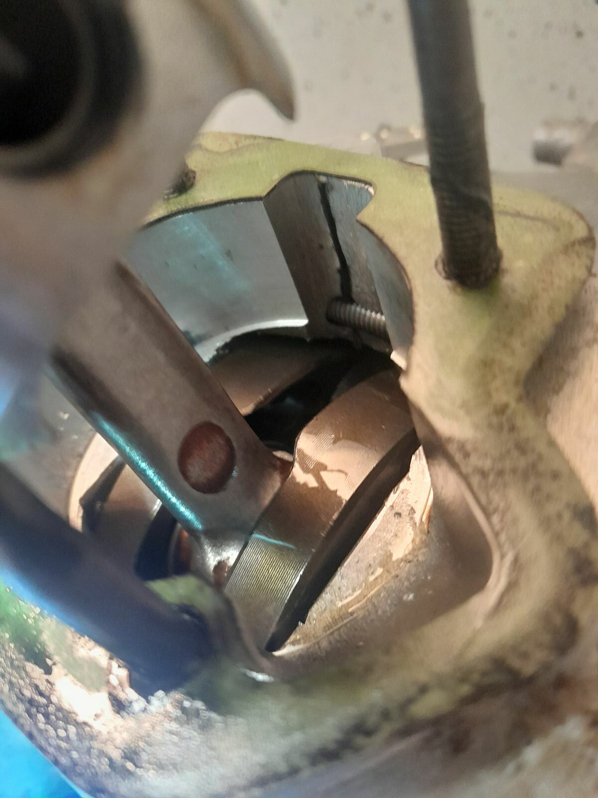 Zusammenschweißen, schleifen, lackieren, wieder einbauen, dabei ein Blick auf die Kette - oberes Kettengummi durchgeschliffen...