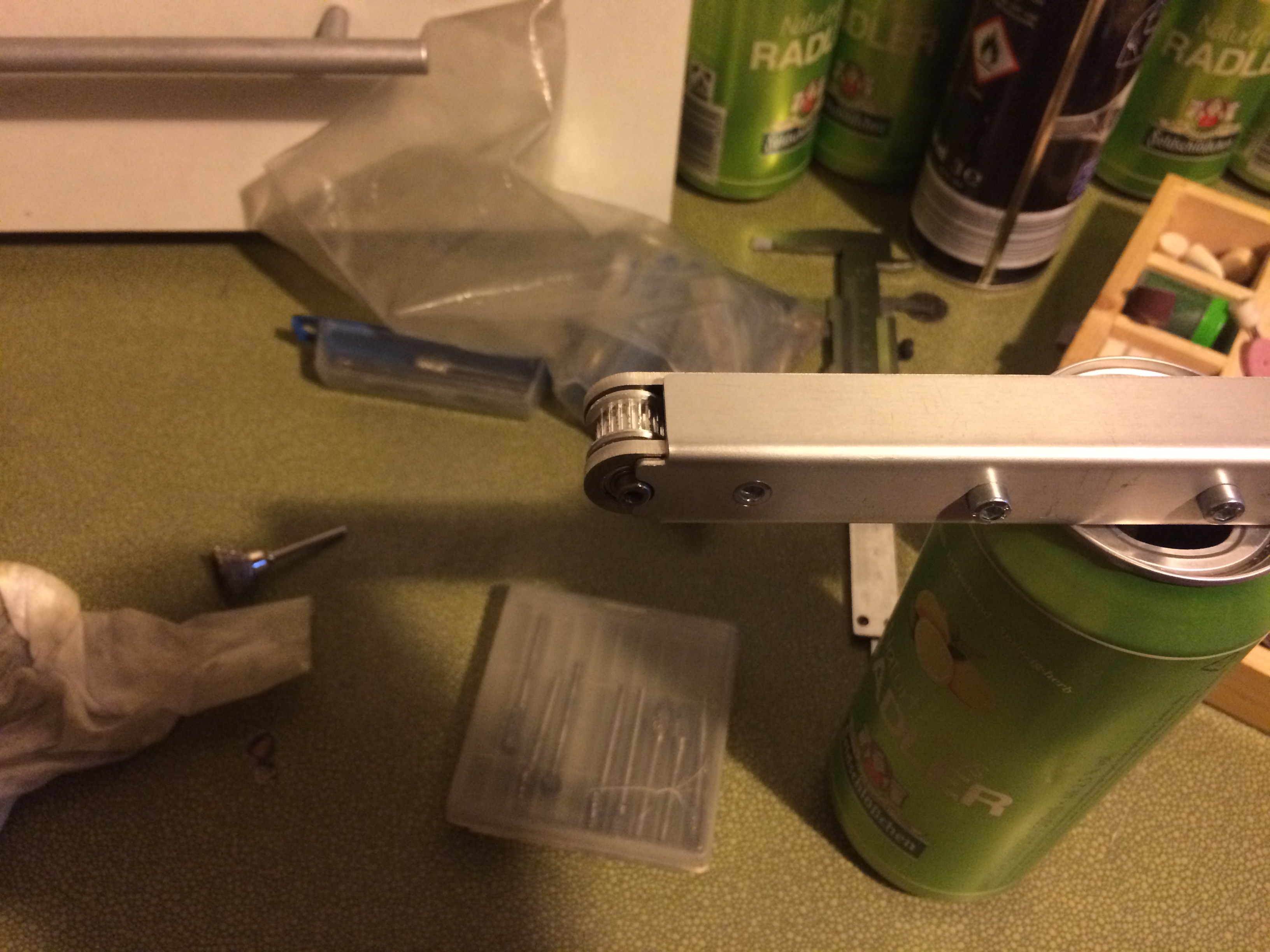 Eine Hohlwelle im Ritzel verklebt, Riemen und Motor anprobiert.