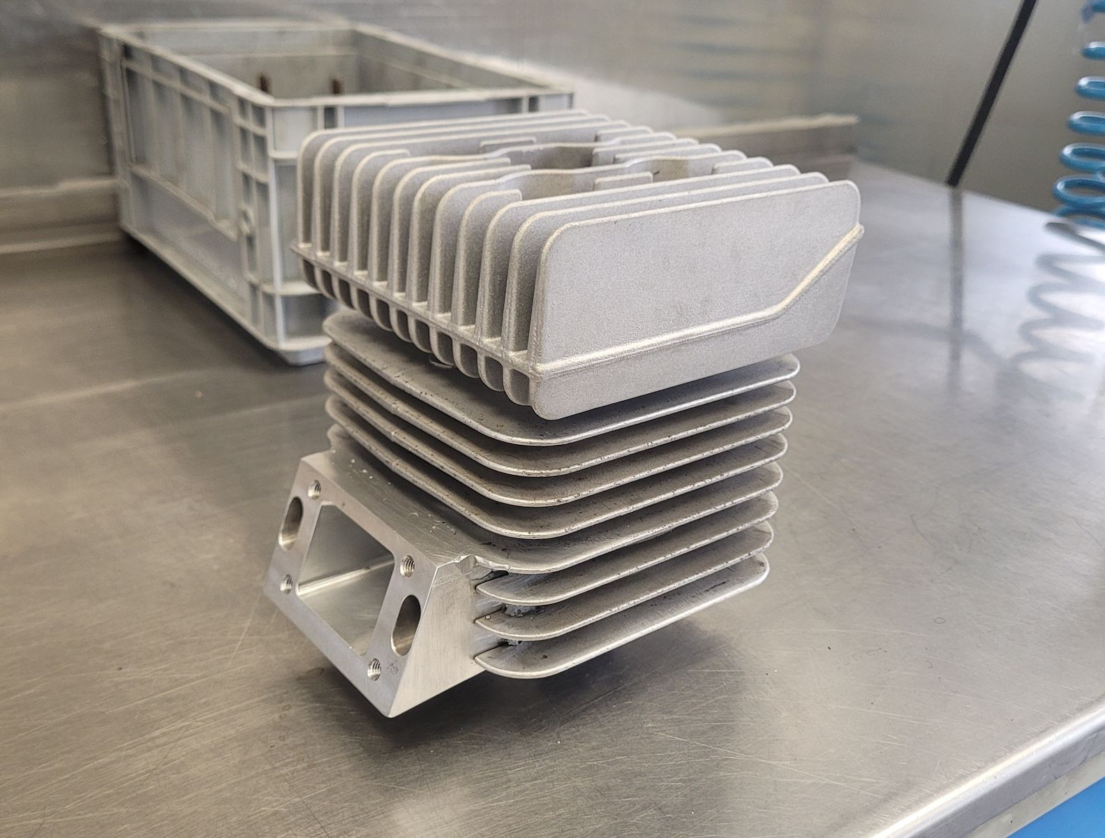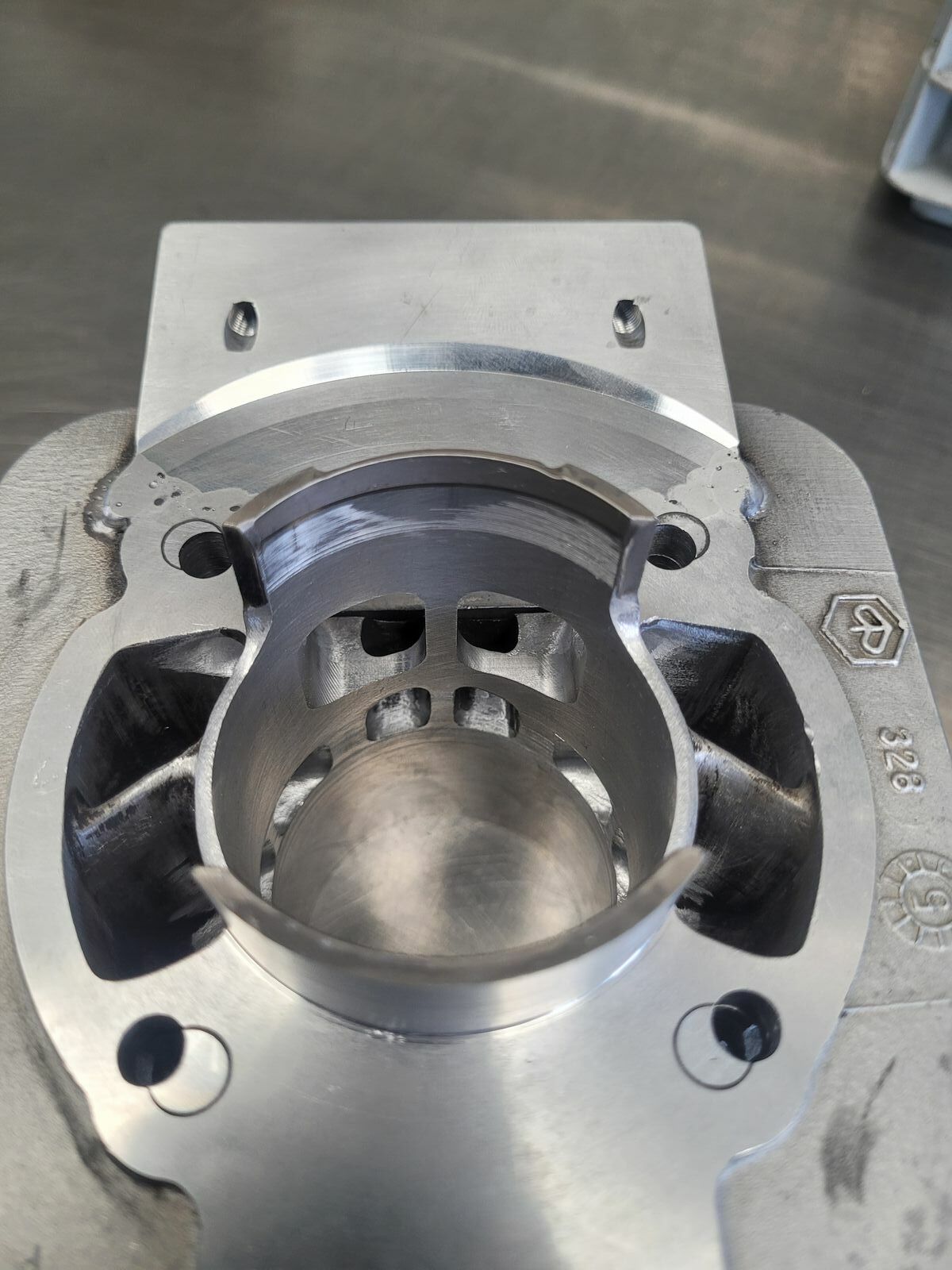 Die Umsetzung. Da der Gilardoni original 55mm Bohrung und einen für Simsonzwecke ungeeigneten Kolben hat (16er Kobo) und es für 55mm Bohrung keine wirklich brauchbaren Alternativkolben gibt, wurde der Zylinder auf 56mm Bohrung gebohrt. Da der Zylinder keinen Einlass besitzt (Direktmembran), wurde ein Einlass in den Zylinder gearbeitet. Der gerade und für Simson unbrauchbare Auslassflansch wurde weggefräst und ein Auslasskanal mit Simsongewinde angeschweißt. Die asymmetrischen Stehbolzenlöscher wurden verschlossen und neu gebohrt. Anschließend wurde der Zylinder in Sachen Höhen und Kanalgestaltung an die Gegebenheiten angepasst.