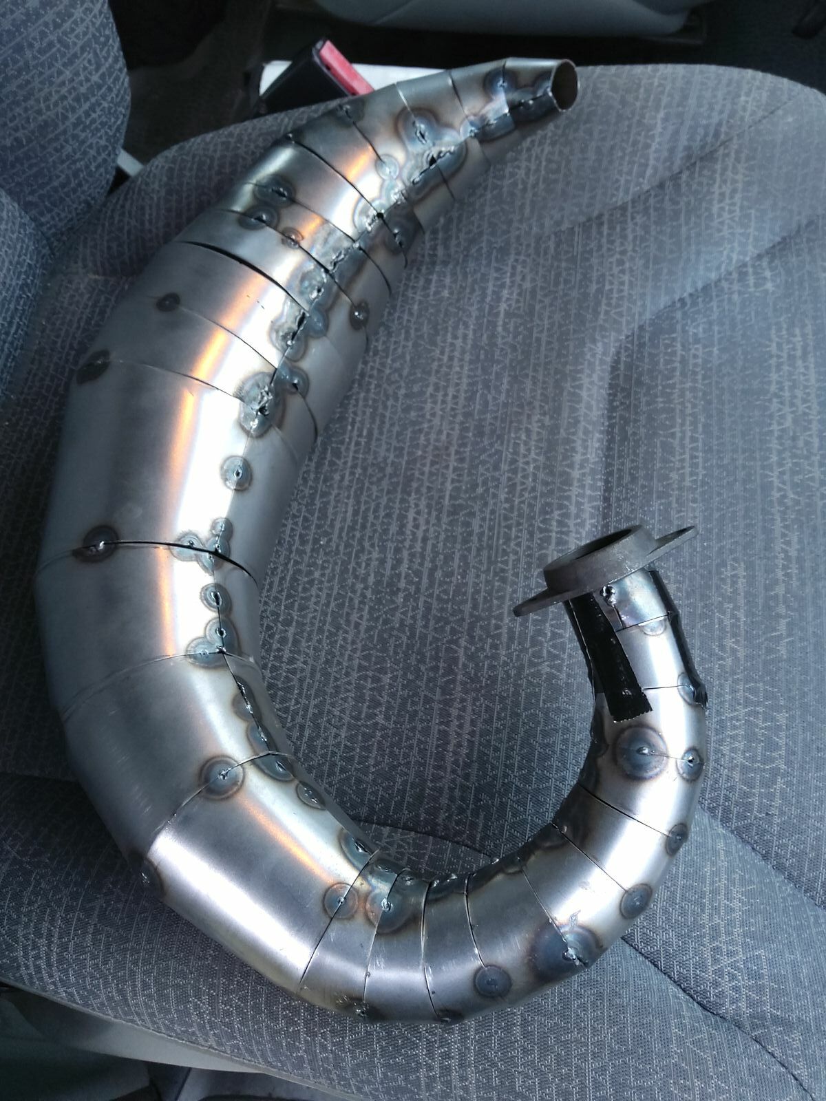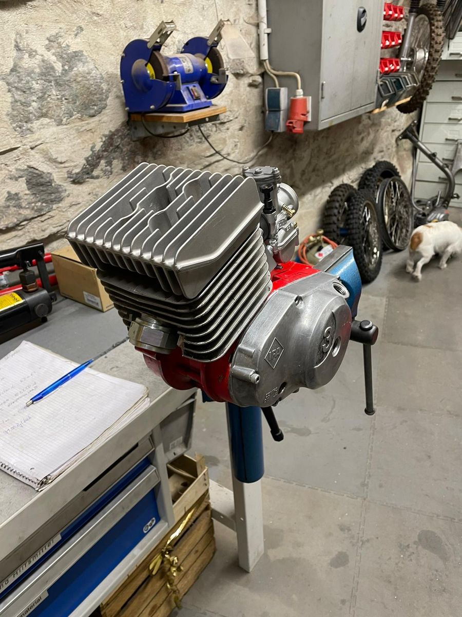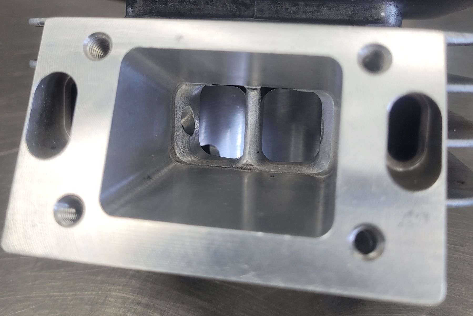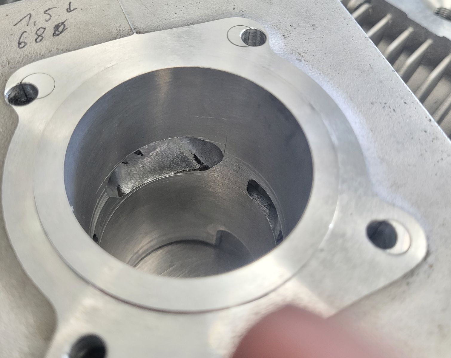 Die Umsetzung. Da der Gilardoni original 55mm Bohrung und einen für Simsonzwecke ungeeigneten Kolben hat (16er Kobo) und es für 55mm Bohrung keine wirklich brauchbaren Alternativkolben gibt, wurde der Zylinder auf 56mm Bohrung gebohrt. Da der Zylinder keinen Einlass besitzt (Direktmembran), wurde ein Einlass in den Zylinder gearbeitet. Der gerade und für Simson unbrauchbare Auslassflansch wurde weggefräst und ein Auslasskanal mit Simsongewinde angeschweißt. Die asymmetrischen Stehbolzenlöscher wurden verschlossen und neu gebohrt. Anschließend wurde der Zylinder in Sachen Höhen und Kanalgestaltung an die Gegebenheiten angepasst.