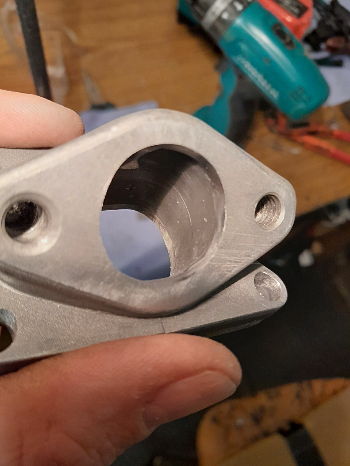 Hab eine Keilplatte (notwendig damit der Vergaser nicht auf dem Motorgehäuae aufsetzt) angefertigt und diese mit dem Mikuni-Stutzen verklebt. Anschließend mit JB Weld gefüllt (den groben Durchlass habe ich mit einem Gummi ausgespart, um JB Weld und Fräszeit zu sparen).