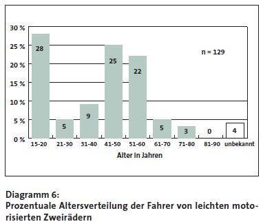 Die Gruppe zwischen 41-60 die mit der größten Fahrpraxis, haben einen Anteil von fast 50%. Die Gruppe zwischen 15-30 macht da gerade mal ein Drittel aus und dabei haben die 15-20-jährigen, welche die Fahranfänger darstellen, einen Anteil von 85%.