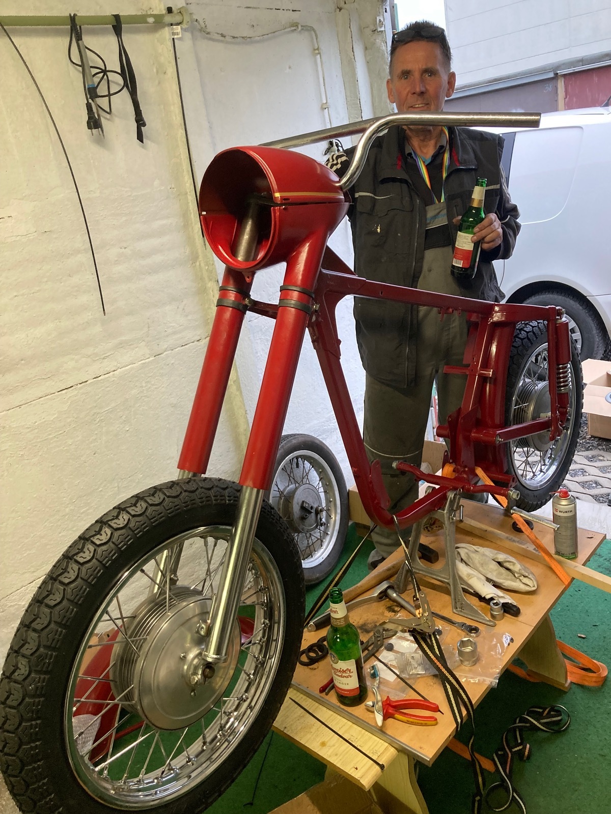 So, nachdem uns der Einbau des 350er Hinterrades in die 175er mächtige Probleme gemacht hat, ging’s heute mit einigen Anpassungen recht flott und wir haben ein bissel was geschafft….
