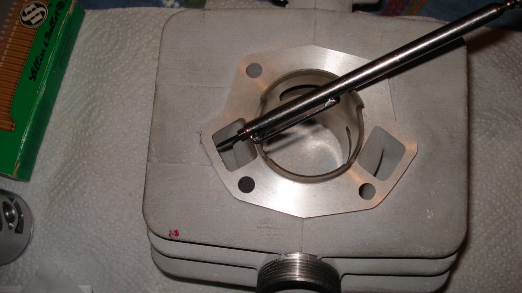 ich habe das überarbeitete Reso Set von RZT bekommen und möchte Euch es vorstellen. Es ist alles dabei-einiges sogar doppelt. Die beiden "extra" Kolbenbolzen Clips werden wohl noch von dem MZA Kolben sein und 2 zusätzliche Vergaser Stehbolzen sind auch noch dabei. Der Zylinderkopf wurde abgedreht um die Steuerzeiten für den Kolben anzupassen. Am abgedrehten Zylinderfuß ist mir Grad an den Spülkanälen aufgefallen (hat man eine "größere" Dichtfläche).;-) Die Zylinderfußdichtung(MZA) muß etwas abgeschnippelt werden da sie sonst über den Spülkanälen liegt(1-1,5mm).Am Zylinder wurde der Auslaß(Oberkante) beschliffen und der Zylindereinlaß erweitert. Der Kolben ist am Einlaß gekürzt. Das Kolbenhemd steht beidseitig ca.2,5mm über die Spülkanäle Richtung Auslaß.Die Anlaufflächen sind konisch (oben 17,80mm) Die Anlaufflächen am Kolben sind leider nicht plan geschliffen(2mm Toleranz Kolbenauge oben/unten).