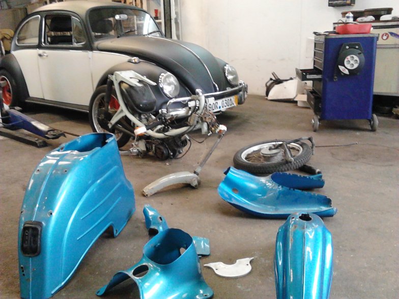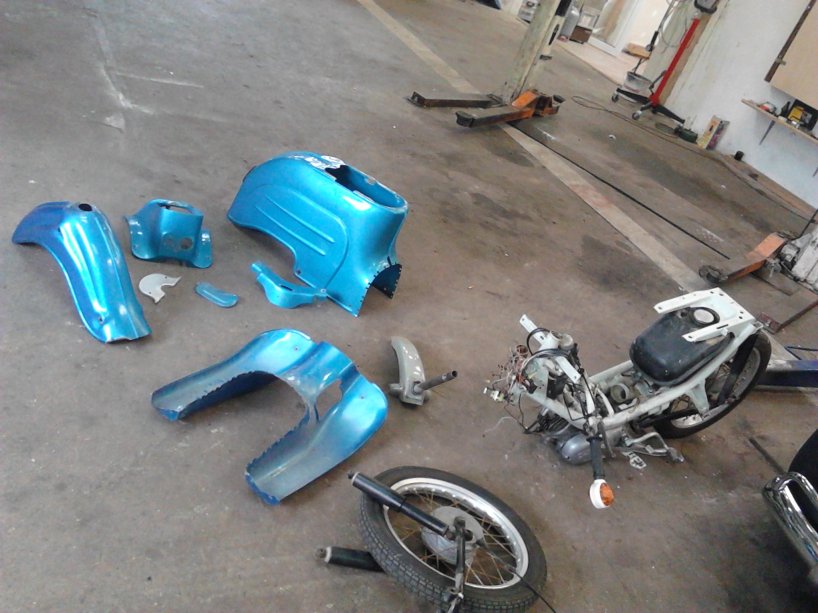 Das ist das gute Stück. Nicht komplett zusammengebaut, aber alle Teile dabei. Papiere leider keine, aber dürfte ja nicht das große Problem sein. Immerhin springt der Motor schonmal an ![]()