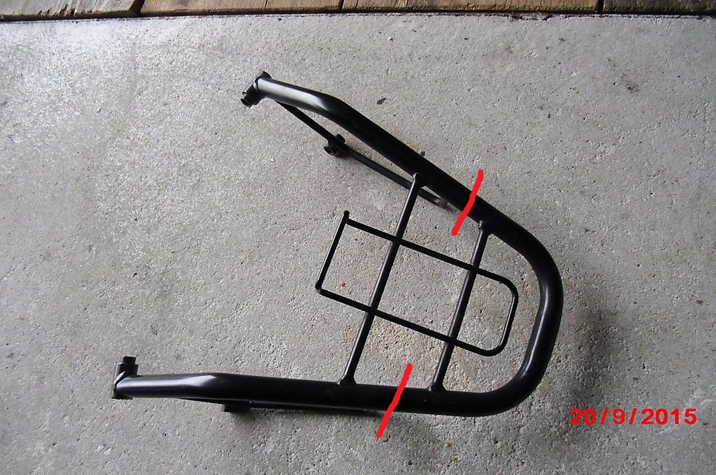 Ein Gepäckträger von einer S51 würde nicht so passend sein. Eher einer von einem Roller. An den Trennstellen (rot) wird der abgetrennt und dann an den Haltegriff vom S53 wieder angeschweisst. -