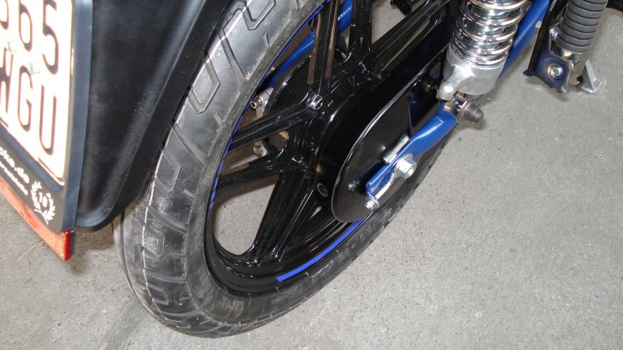 Ich habe mal die beiden verglichen. Außer das innen die Übersetzung anders ist-sind die beide fast baugleich. Der Unterschied besteht in der Länge der Distanzstücke im Nabentacho. Die 16Zoll Gußradausführung 19mm und die 17Zoll Speichenradausführung 21mm. Die Sch..... Enduro Streben passten auch nicht ( um 8mm). Dremel ran und die linke Strebe noch etwas gebogen. Die Klappfußrasten (der billige Nachbau) werde ich zurück schicken. Die sind anders gebogen wie die Teile von MZA. Sogar mit einem Stino-Auspuff stößt man oben schnell ran. Bereifung habe ich Vee Rubber VRM 089 genommen. Vorn 80/90x16 hinten 90/90x16.(das sind sogar P-Reifen..bis 150km/h). In der Betriebserlaubnis stehen ja auch 80/90 Reifen drin. Der Nachteil-der Kippständer kippelt jetzt etwas. Da werde ich in der nächsten Woche mal 1cm starke Aluplatten ran schweissen. Im nach hinein ist mit noch eingefallen,dass ich ja auch hinten eine SB einbauen könnte. Ich habe noch eine Vorderrad-Gußfelge und an der sind ja beidseitig Bohrungen für eine SB. Also-auf eine Seite die SB und auf der anderen Seite das Ritzel evtl. noch Aludistanzscheiben drehen. Aber ist ja alles schon gepulvert..... -