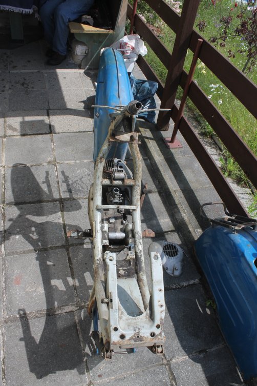 Bis dahin muss ich noch viele Teile besorgen, ein paar teile sind schon angekommen, wie z.B. Lenker, Stoßdämpfer vo+hi, 2 kompletträder, Kickstarter, Ladeanlage, 2 Bowdenzüge und das eckige Rücklicht (leider nicht vollständig; das Blech und der Gummi darunter fehlt leider)