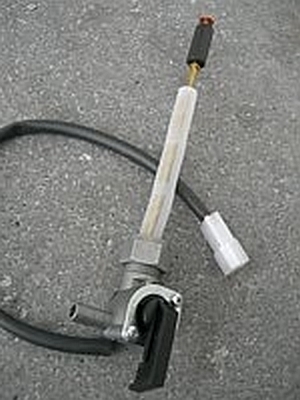 Das obere schwatte Teil wird wohl ein Schwimmer sein und so hoffe ich, im Benzinhahn über die Messingstange/rohr zwei elektrische Kontaktflächen/Reed-Kontakt beim Absenken aktivieren.