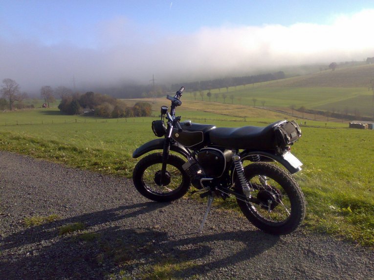 Aber hier mal n Bild von meinem Moped. Ich fahr die K63, vorn 80/80 16 auf ner 1,85er Felge und hinten die 90/80 16 auf ner 2,15er Felge. Beide Felgenringe sind aus Alu und von einer MZ. Das sind nicht die RSW reifen, die kommen diese Saison