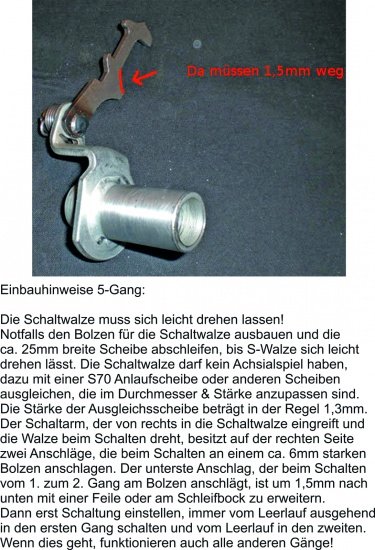 Um ein 5 Gang vernünftig zum Schalten zu bekommen, muss vorn an dem Mitnehmer des Schalthebels ca 1mm abgeschliffen werden.