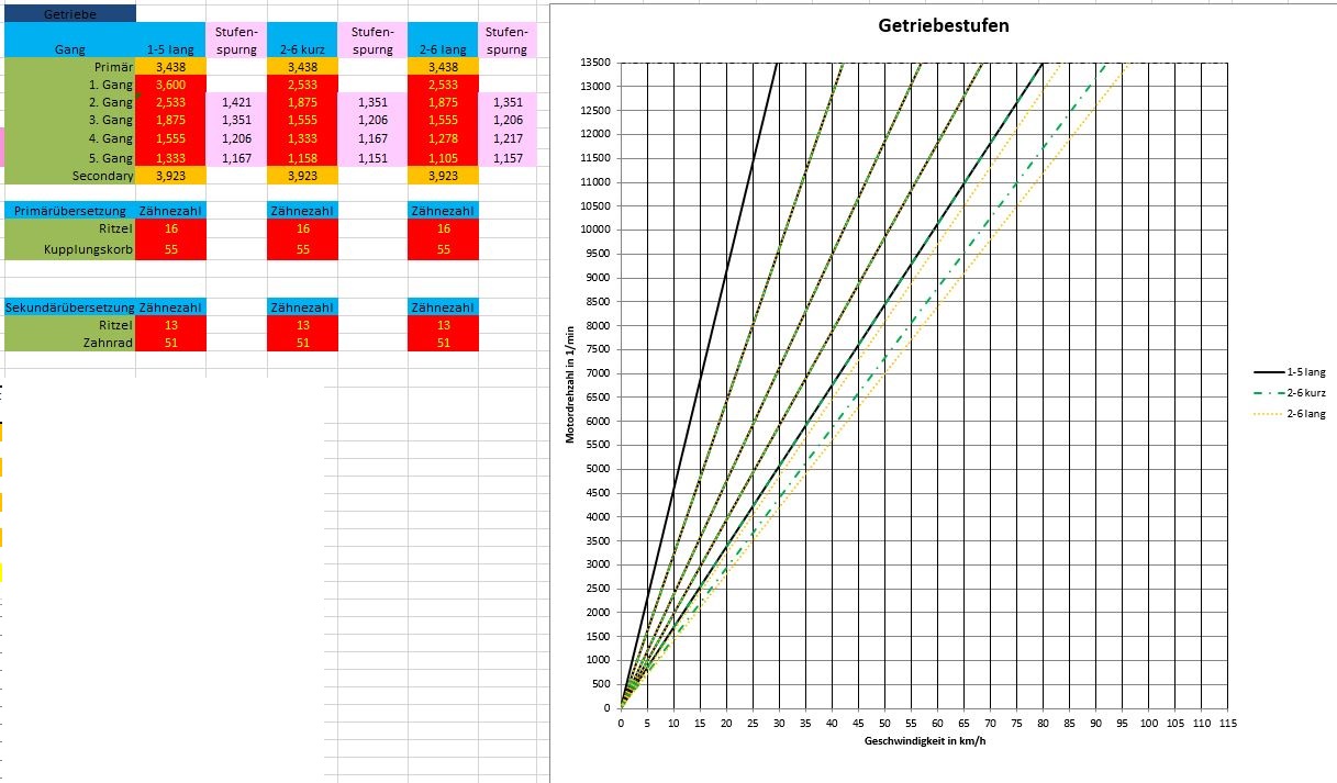 Ein Kumpel und ich, sehen das genau so, das ein gut Abestuftest 6 Gang Getriebe im Alltag was feines wäre.Es kommt oft vor das man trotz 5 Gang Getriebe noch in den 6. schalten möchte.Beide fahren wir 85er Motoren mit 1.Langen Gang und mitleren 5. Gang. Klar könnte man auch länger Übersetzten aber dann fehlt wieder der schöne Durchzug von unten raus.