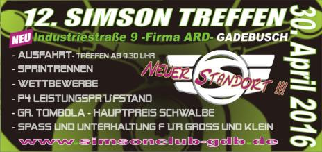 das 12. Simson-Treffen in Gadebusch (Nordwestmecklenburg) findet am 30. April 2016 statt. Alles weitere könnt ihr dem Bild entnehmen. Es ist natürlich schade, dass es in diesem Jahr so früh ist, aber was soll's. ![]()