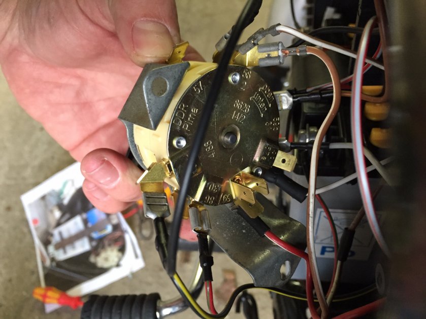 Anschlüsse 59 und 59b versehentlich vertauscht, Kabelfarben sind ja rt/gr und rt/ws. Würde dazu pasen, daß das Front- und Rücklicht sowie Tachobeleuchtung und Standlicht nicht gehen. Beim Neuaufbau meines Rollers hatte ich das Kabel vom Abblendschalter mit dem Blinker verwechselt (identische Kabelfarben).