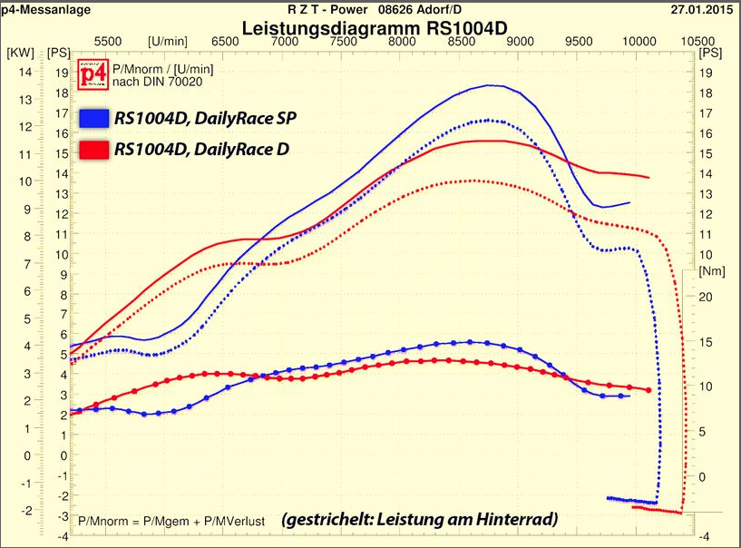 Beim SP fällt die Leistung bis 9600 relativ zügig von 18 PS auf 12 PS. Der DailyRace D hat bei dieser Drehzahl mehr Leistung und Drehmoment. Er kann weiter ausdrehen / überdrehen.