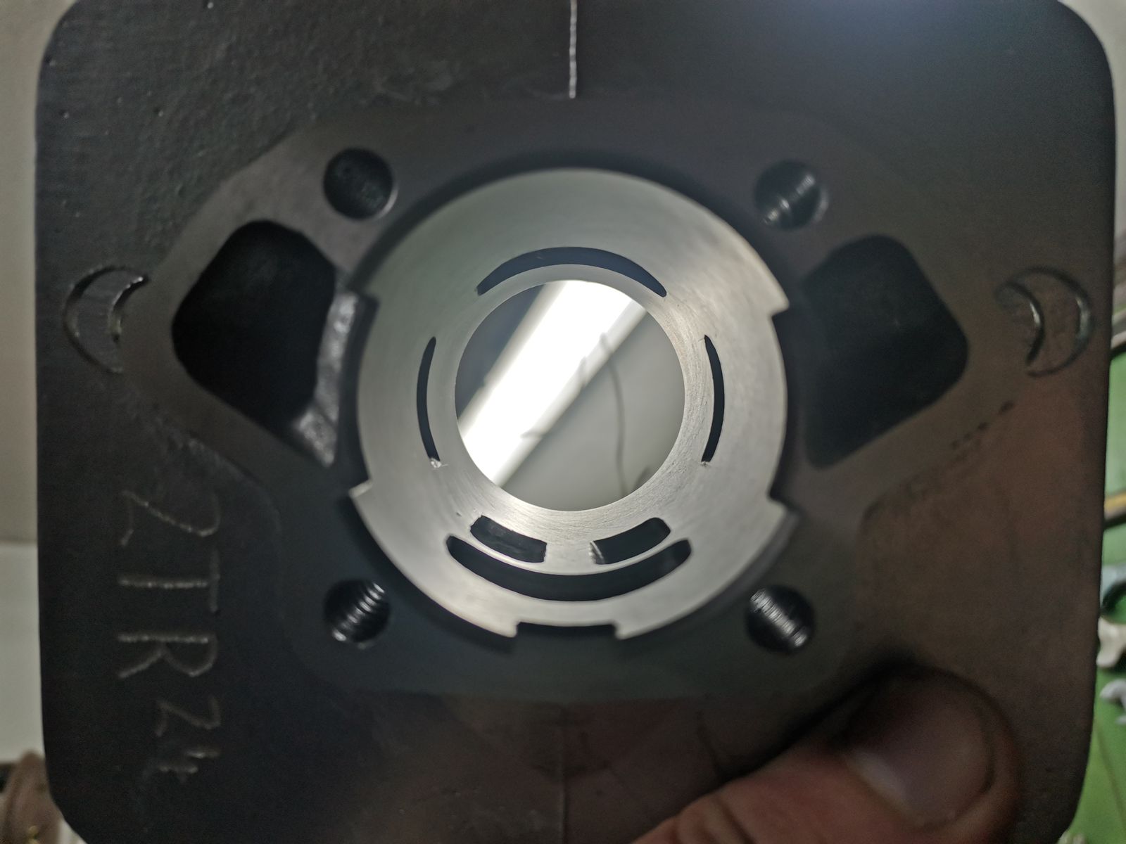 Parallel zu all dem ist ein schärferer S50 Vierkanal Zylinder mit 21er Einlass entstanden, der es dank Distanzplatte (Eigenbau) und 44mm Hub auf 70ccm bringt. Dazu natürlich ein Megu Kolben mit Fenstern. (SZ = 186 125 157)