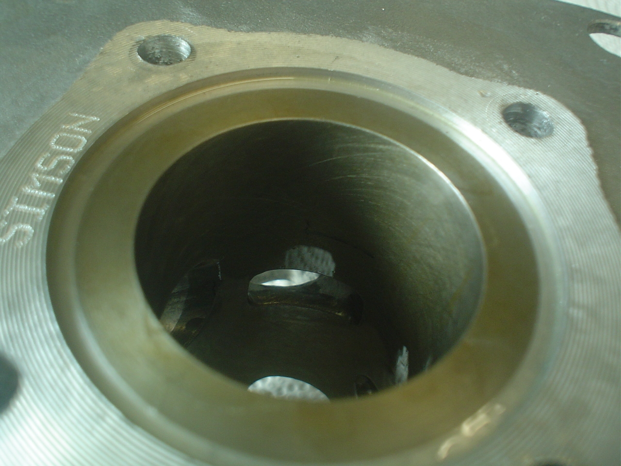 Zylinderansicht auf dem Zylinderfuß, man erkennt die Bearbeitung der Überströmer im Aluminium und in der