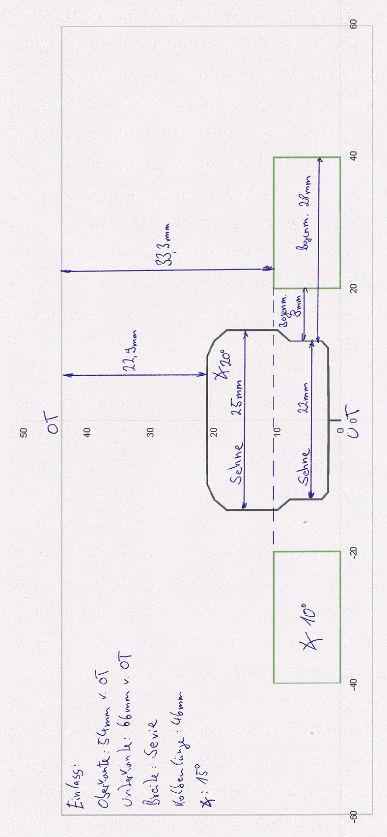 Um den Steuerwinkel von 155° zu erreichen wird der Kolben unten um 4mm auf 46mm