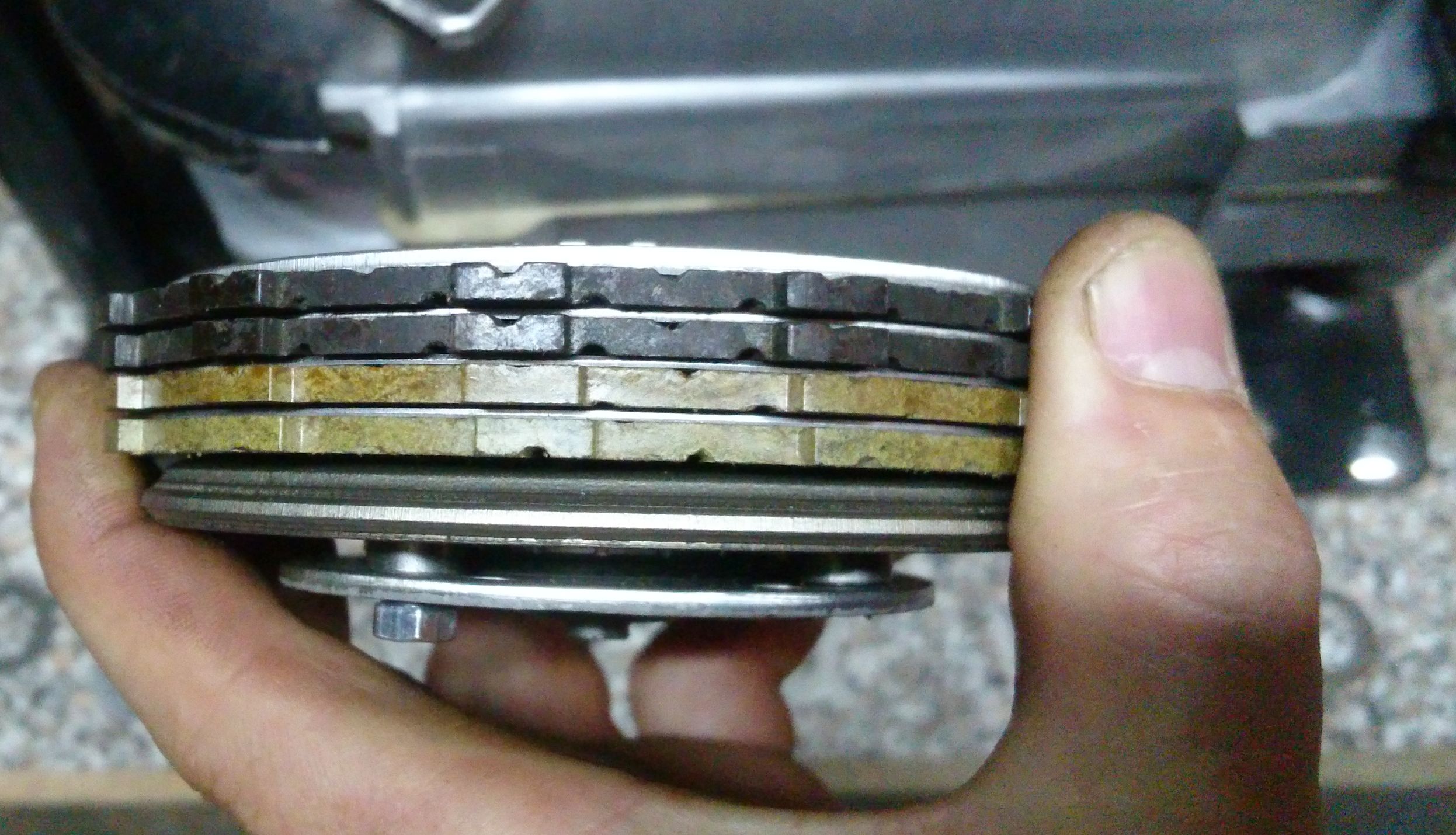 Also Druckstück verkehrt rum aufgeschraubt um das ganze zu richten -> und siehe da , ein Reibbelag fällt auseinander. Dann habe ich das Paket zerlegt und auch ein zweiter Belag war eingerissen.