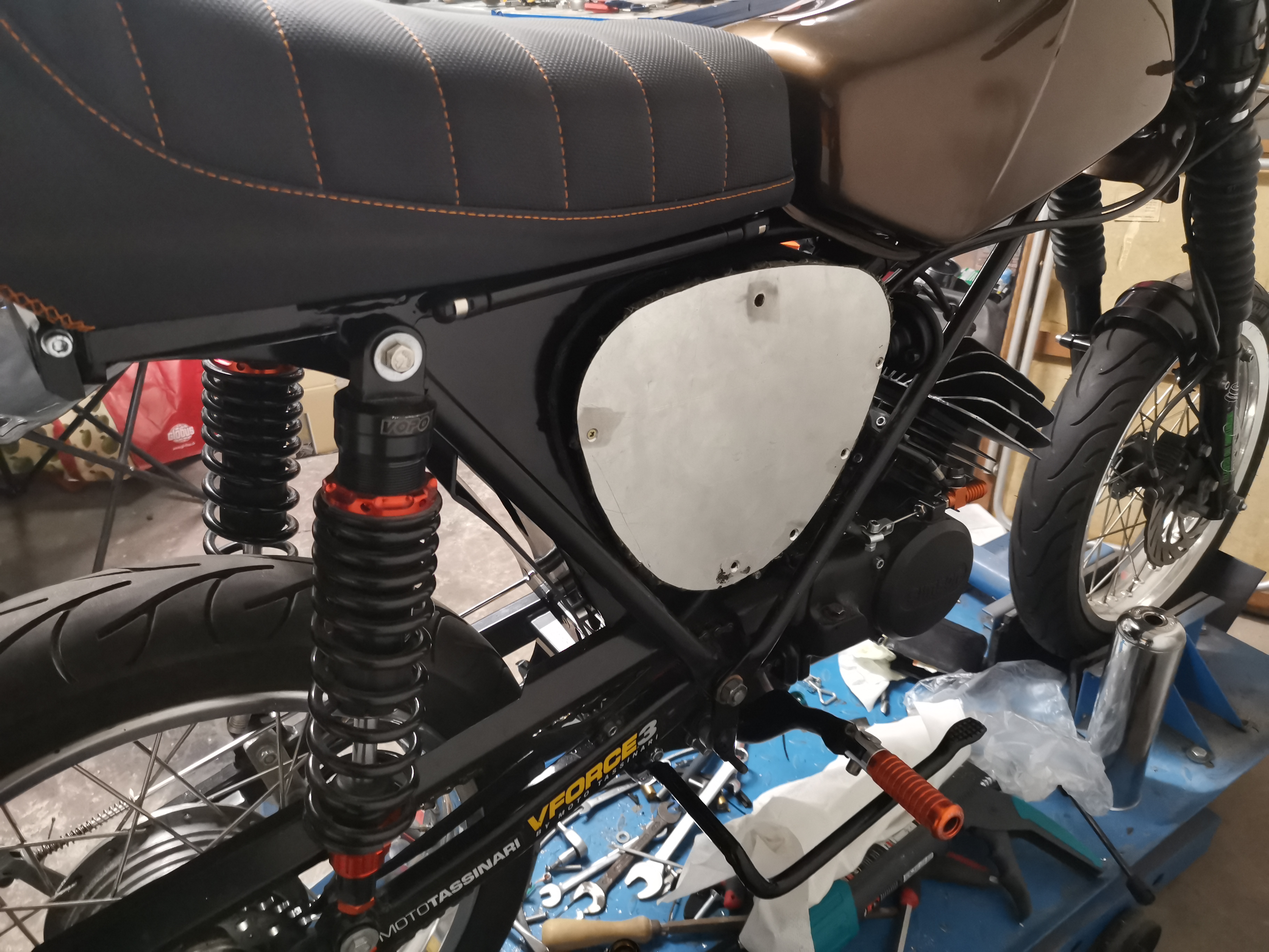 Allgemein wollte ich eher wieder in Richtung original. Die Blinker wurden durch Runde ersetzt, die Standrohre gegen die normel langen getauscht,als Lampengehäuse fand sich noch eins von der S50,der Tank wurde innen versiegelt und als Lenker gab es einen breiteren von Tomaselli. Schutzbleche sind Nachbauten, die Passgenauigkeit ist echt zum schreien gewesen