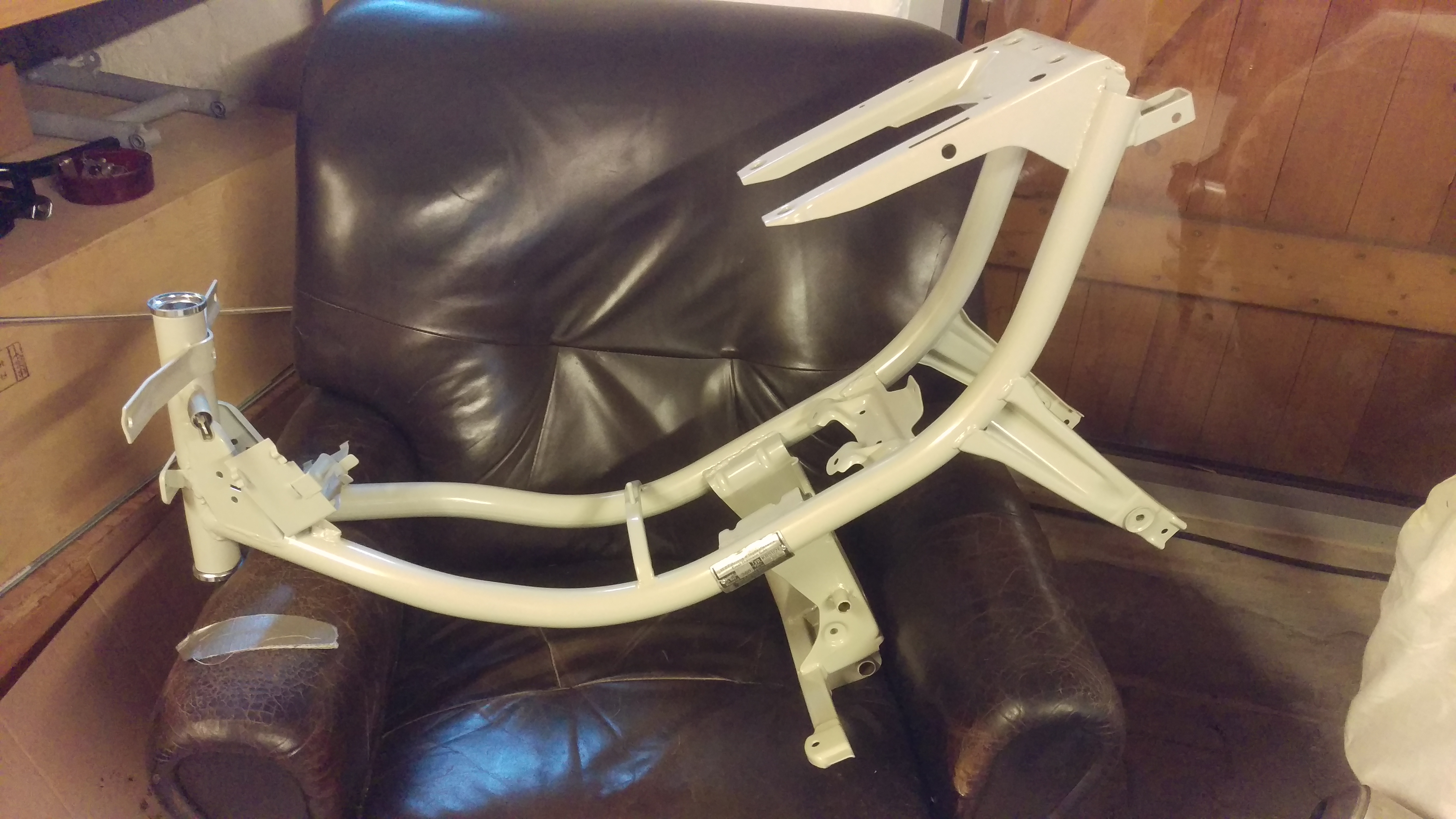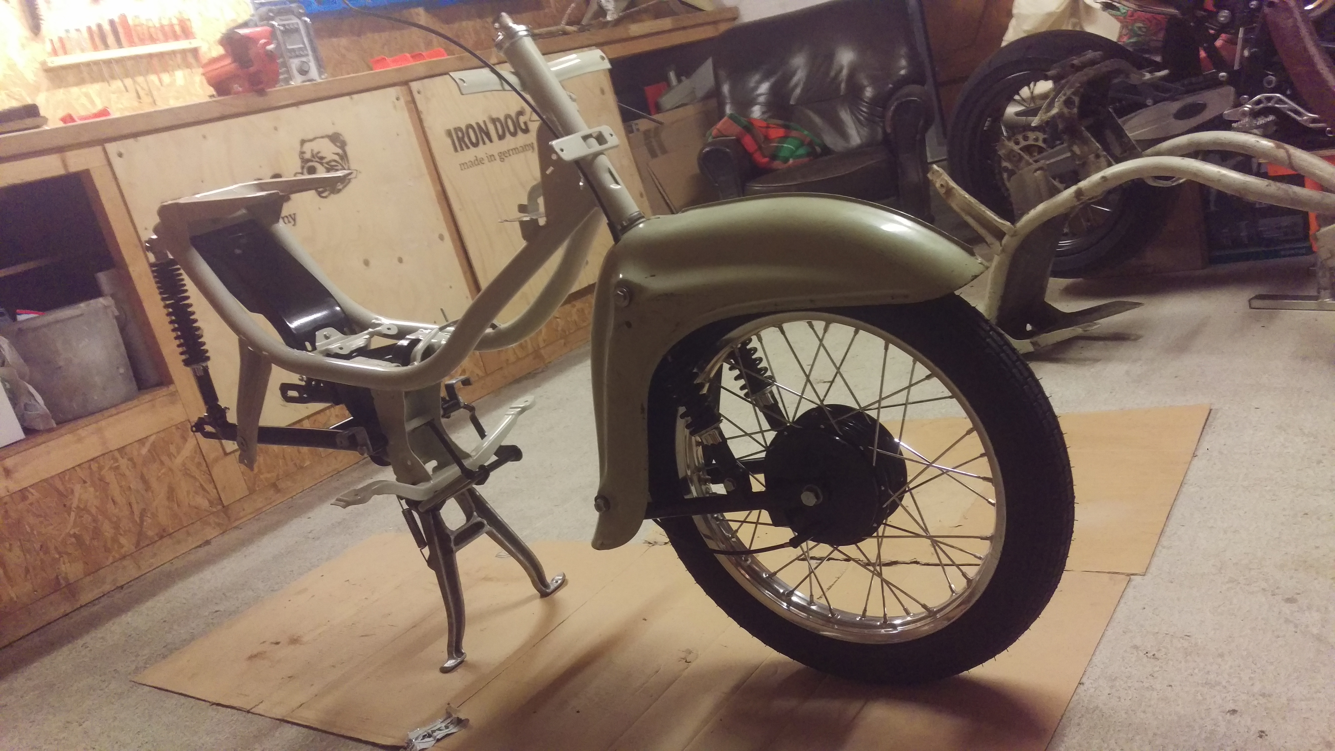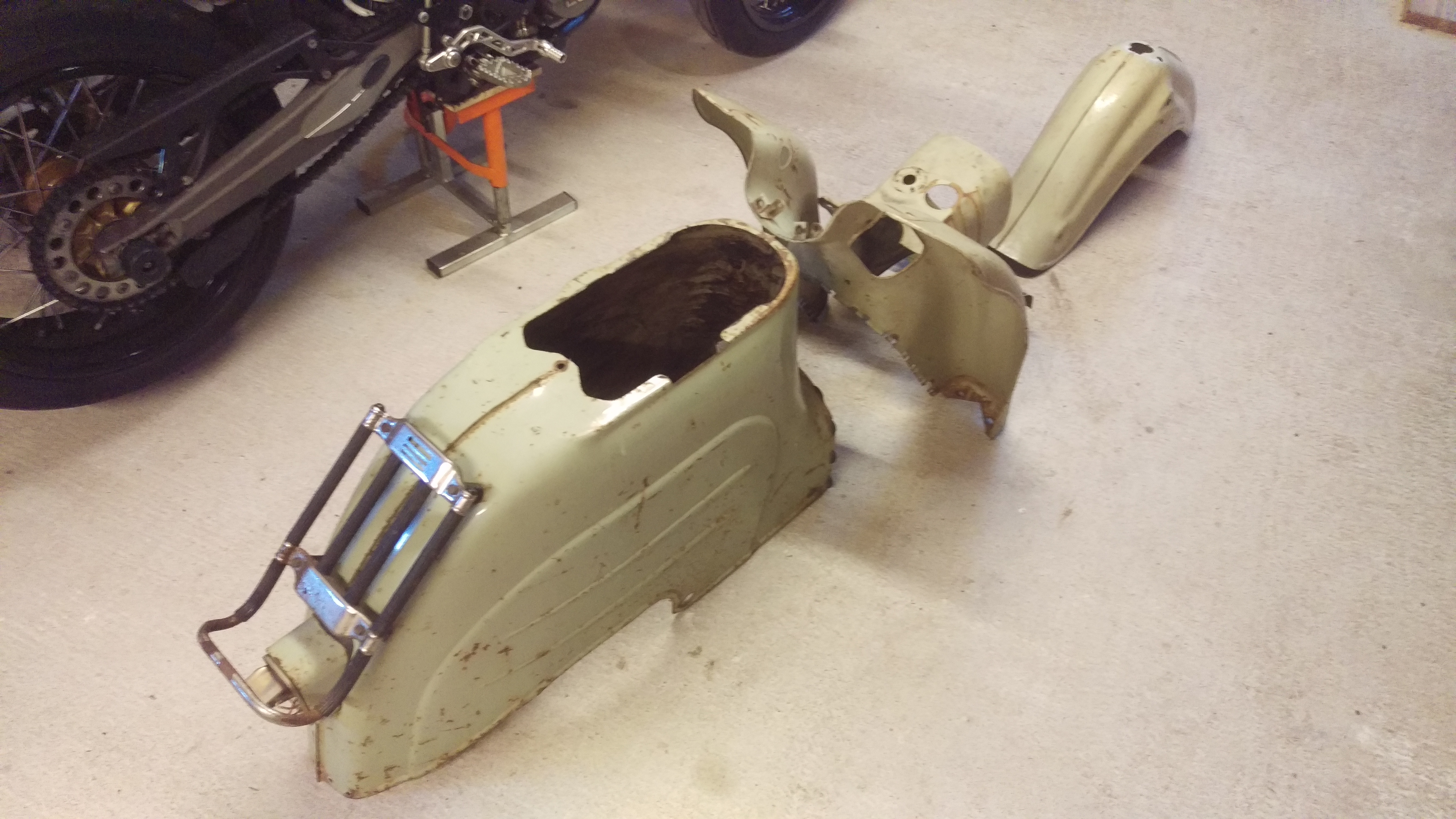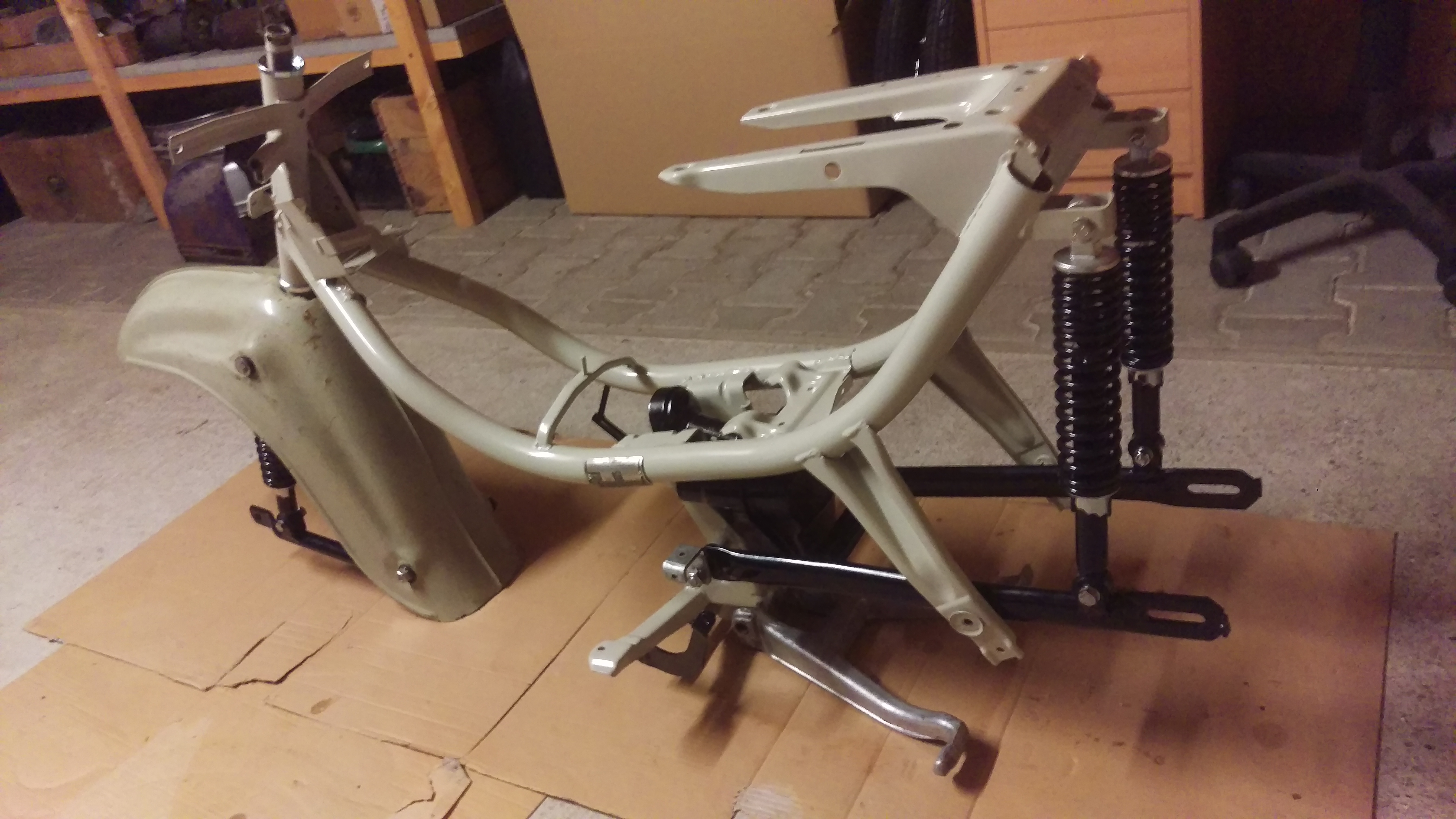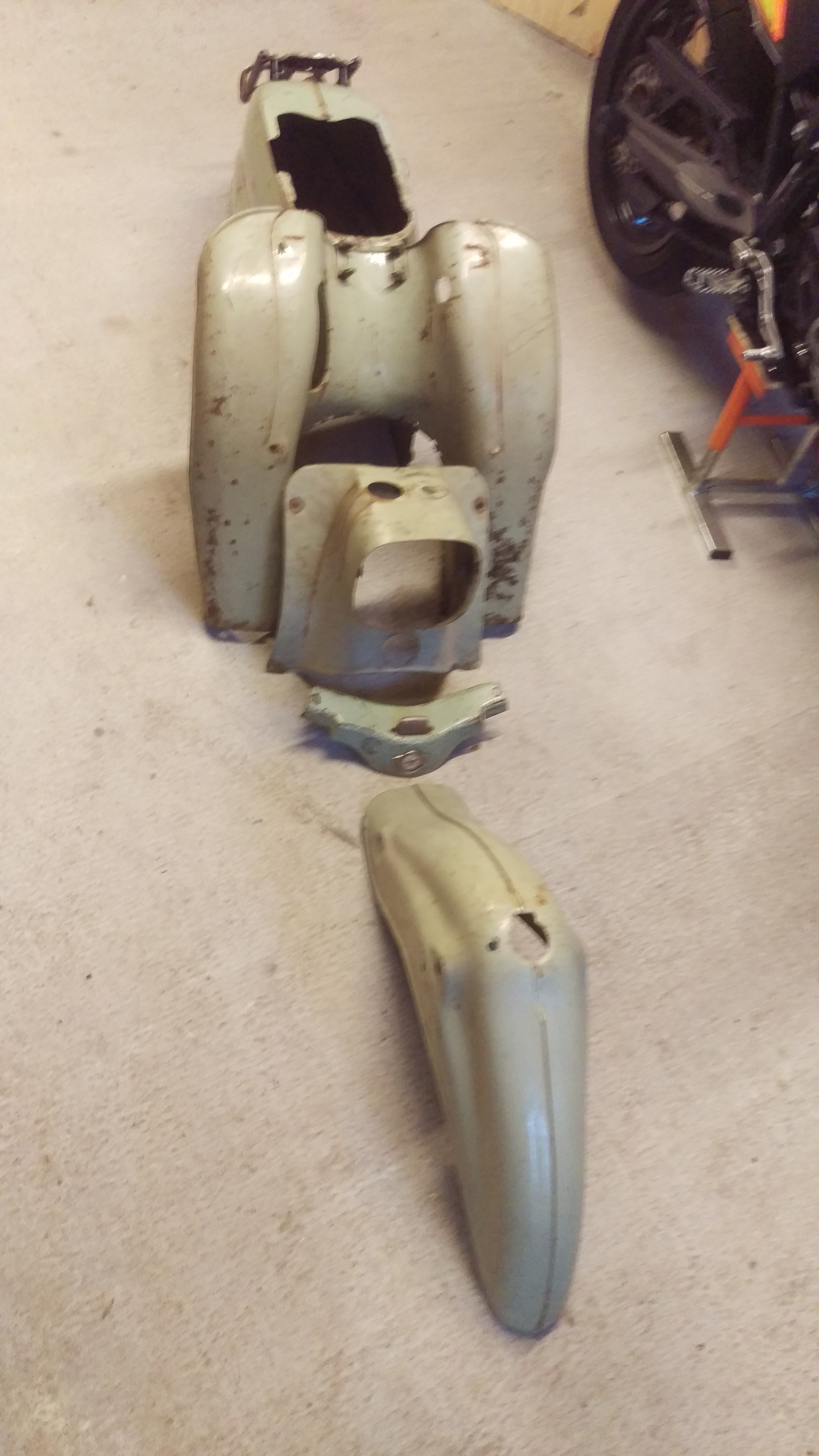 Momentan wurden schon die Rahmenteile pulverbeschichtet und ich habe versucht mir ein tundragraues Blechkleid zusammen zu suchen.. die Blechteile die dabei waren hatten alle unterschiedliche Farben. (Nicht ein Teil hatte Originallack)