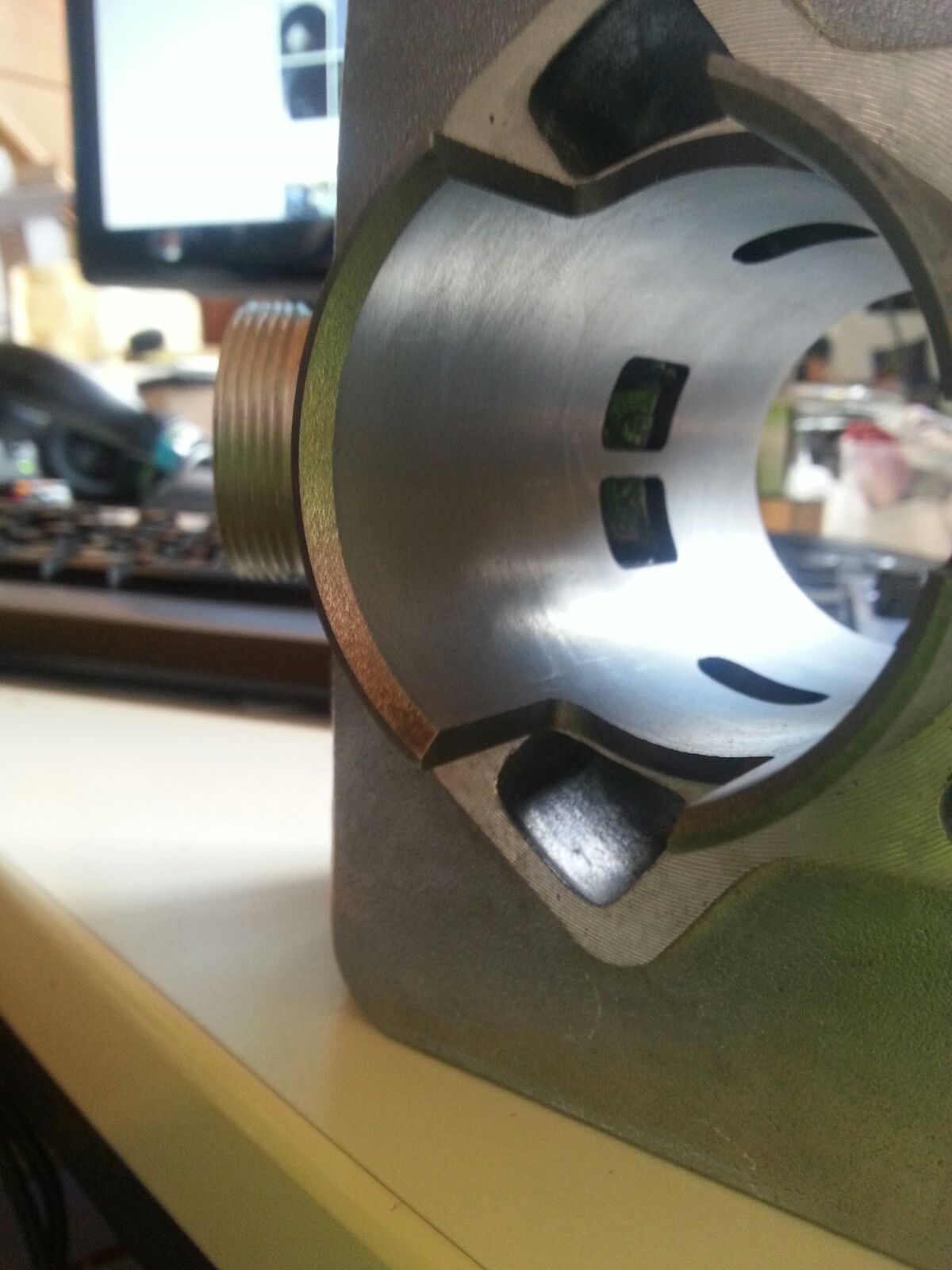 Wie schon gesagt ist auch die äußere Gussform modifiziert, aber nur moderat und kaum ersichtlich. zB ist der komplette Einlasskanal aussen etwas größer, auch am Auslasskanal steht etwas mehr Wandung um zwischen den Rippen nicht raus zu kommen wenn man den Auslass stark nach oben und seitlich vergrößert.