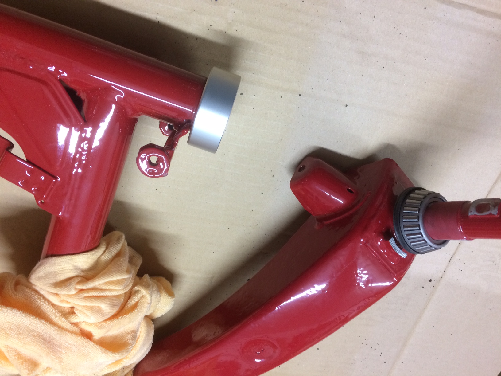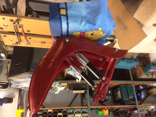 Den Rahmen muss ich kürzen und den Halter für die Lampenmaske drehen und wieder befestigen. Was mir ein wenig sorge macht ist das das untere Lager ein wenig Spiel zu haben scheint auf dem Schwingenträger. Und das obere Lager sehr stramm auf den Schwingenträger drauf geht. Obwohl ich schon sämtliche Reste der Pulverbeschichtung entfernt habe.