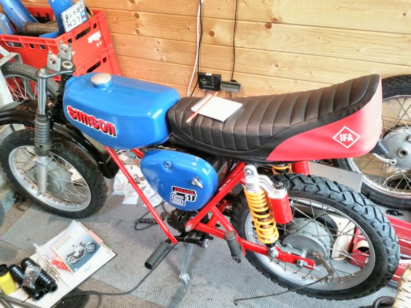 Eine ebenfalls blaue S51 vermeintliche Enduro in zusammengebaut. Bei der heutigen Abholung stellte sich raus, dass der Tacho fehlt, die Endurostreben fehlen und die Papiere sowie Nummernschild aus Polen sind. Daraus schließe ich wegen der Streben (Halter vorne ist ebenfalls nicht vorhanden) dass es keine originale Enduro ist. Der Auspuff wurde wohl nachgerüstet