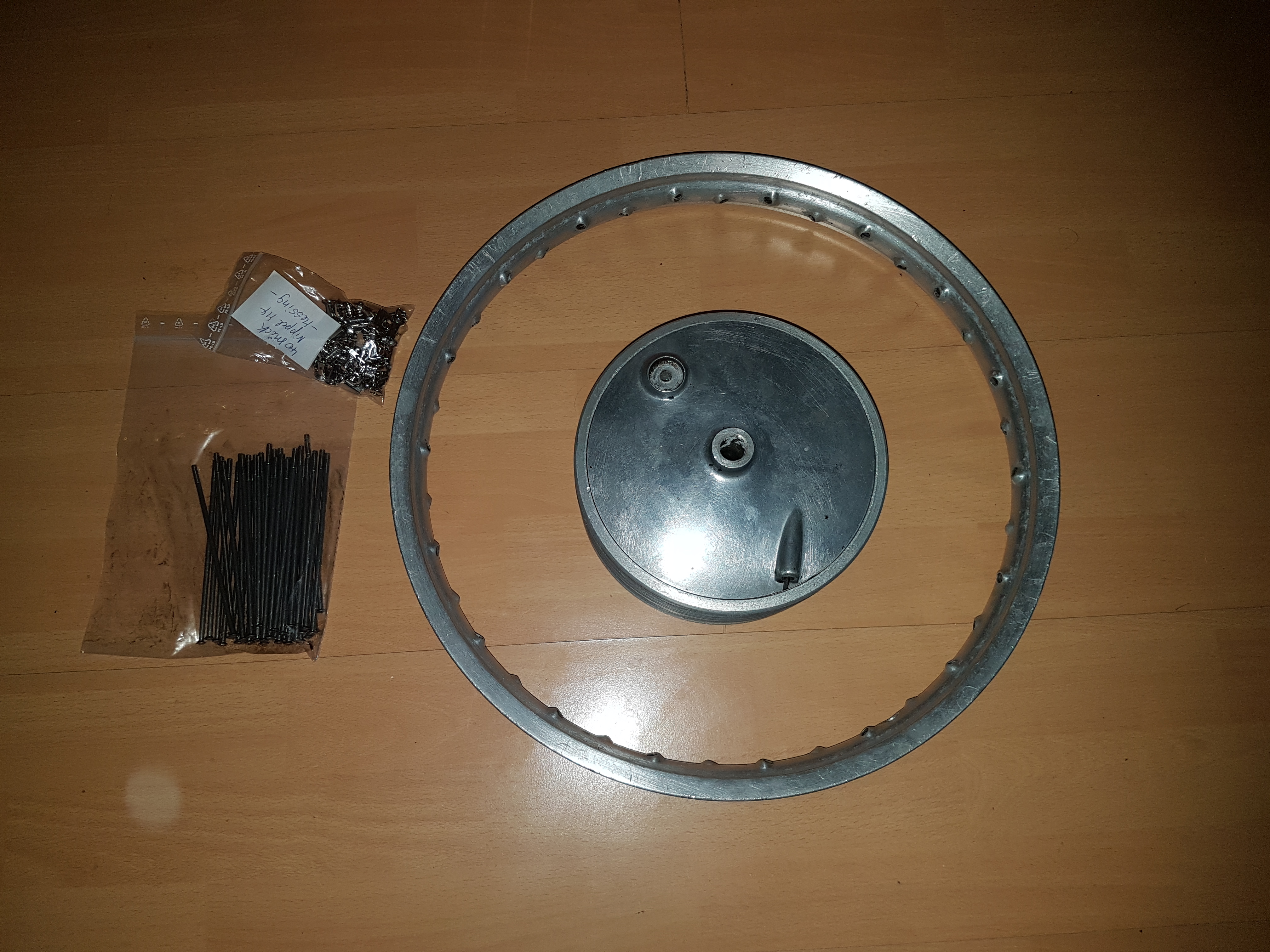 Drin sind die Speichen schonmal, zum Ausrichten gehts heut nicht mehr in die kalte Werkstatt und morgen ist erstmal Verkleidungskerb angesagt. Hydraulikrohr wird nächste Woche gestoppelt...