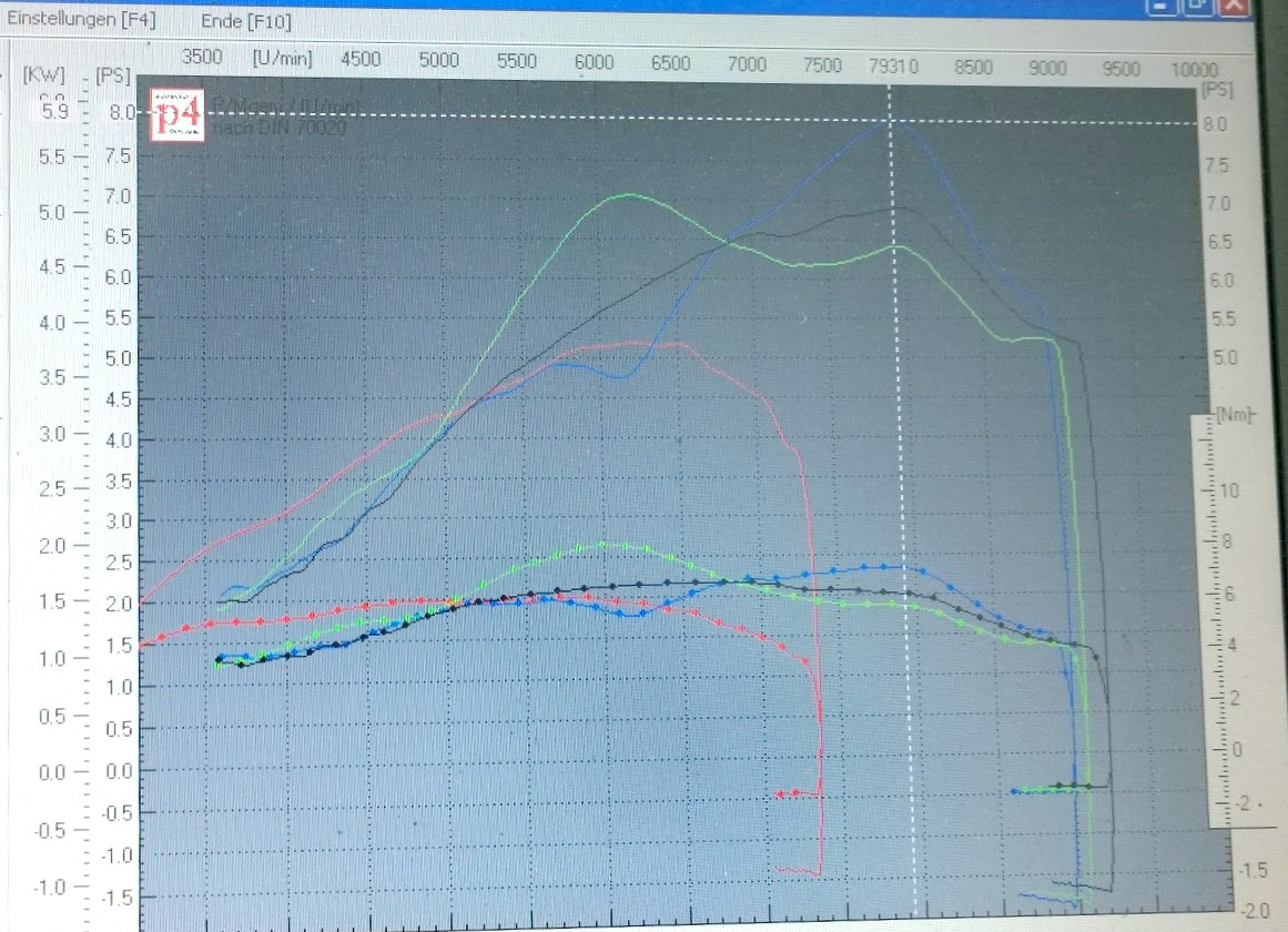 Rausgekommen ist jetzt ein Motor der zwischen 8PS (Serienauspuff) und 9,5PS (Vario28 im Seriendesign leistet. Bilder, Diagramme usw in den nächsten Tagen im Shop, auf die Schnelle schonmal hier. (rot = Serienauspuff, grün = Vario28 D, blau = Vario28 SP).