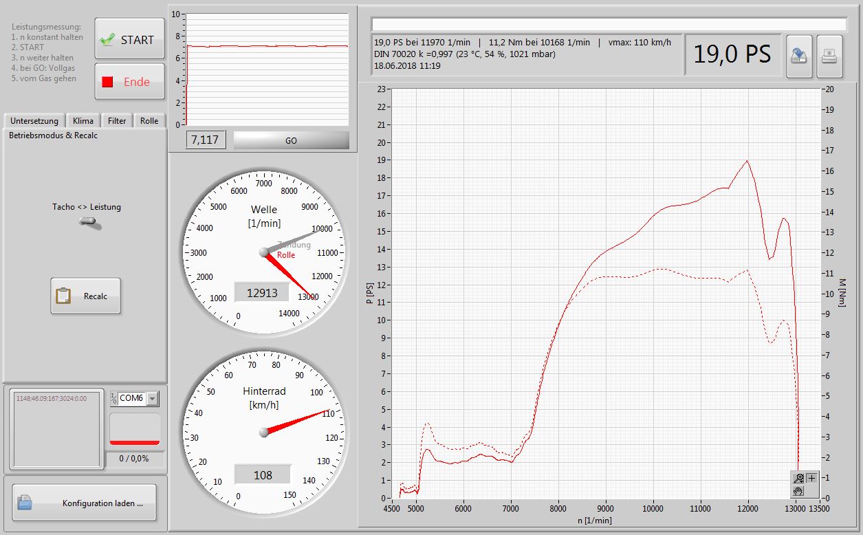 Erste Messung des RZ4KM auf meinem Prüfstand im Harzringmoped (immer Radleistung).