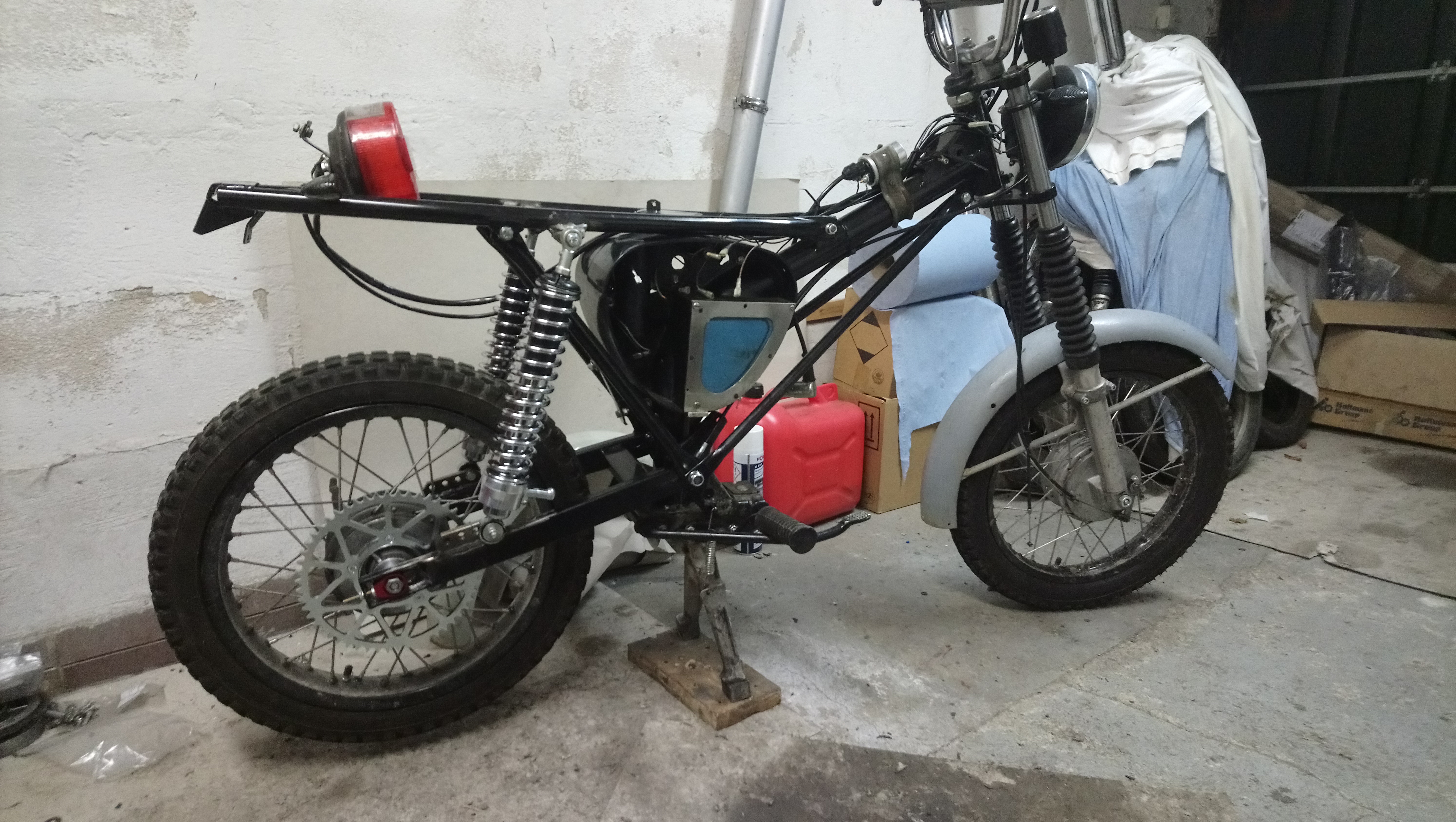 Da ich in einer sehr ländlichen Umgebung mit viel Feldern, Wäldern und Wegen lebe, kam mir Anfang 2017 die Idee ein Wald und Wiesenmoped zusammen zu bauen. Ein schönes Moped für die Straße habe ich schon und ausreichend Teile für ein zweites Moped hatte ich noch auf Lager. Es sollte nicht viel Geld verschlingen, also erstmal alles relativ original belassen. Nur Rahmenteile Pulvern, neuer Kabelbaum, neue Felgen mit Reifen, MS50 mitnehmen, Rollergabel rein, höher Lenker drauf und 12v Elektronikzündung rein.