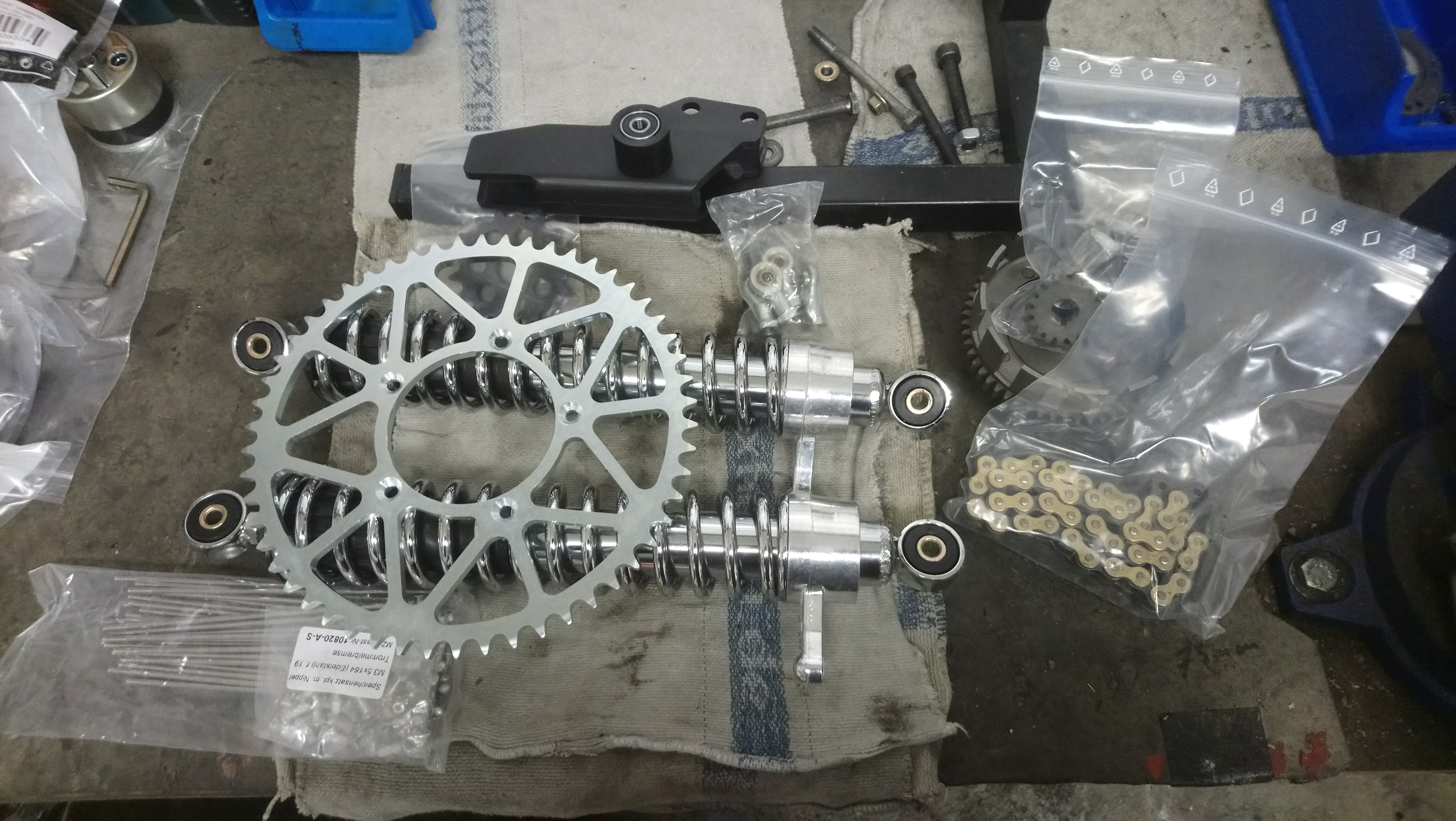 Achso, eine noch etwas stärkere Kette (DID 420 NZ3), in Voraussicht auf die Motorleistung, habe ich auch noch verbaut. Ein Kettenschleifer kommt noch auf die Schwinge. Aber alles in allem bin ich bin der Kettenführung und auch mit der Dämpferposition erstmal ganz zufrieden.
