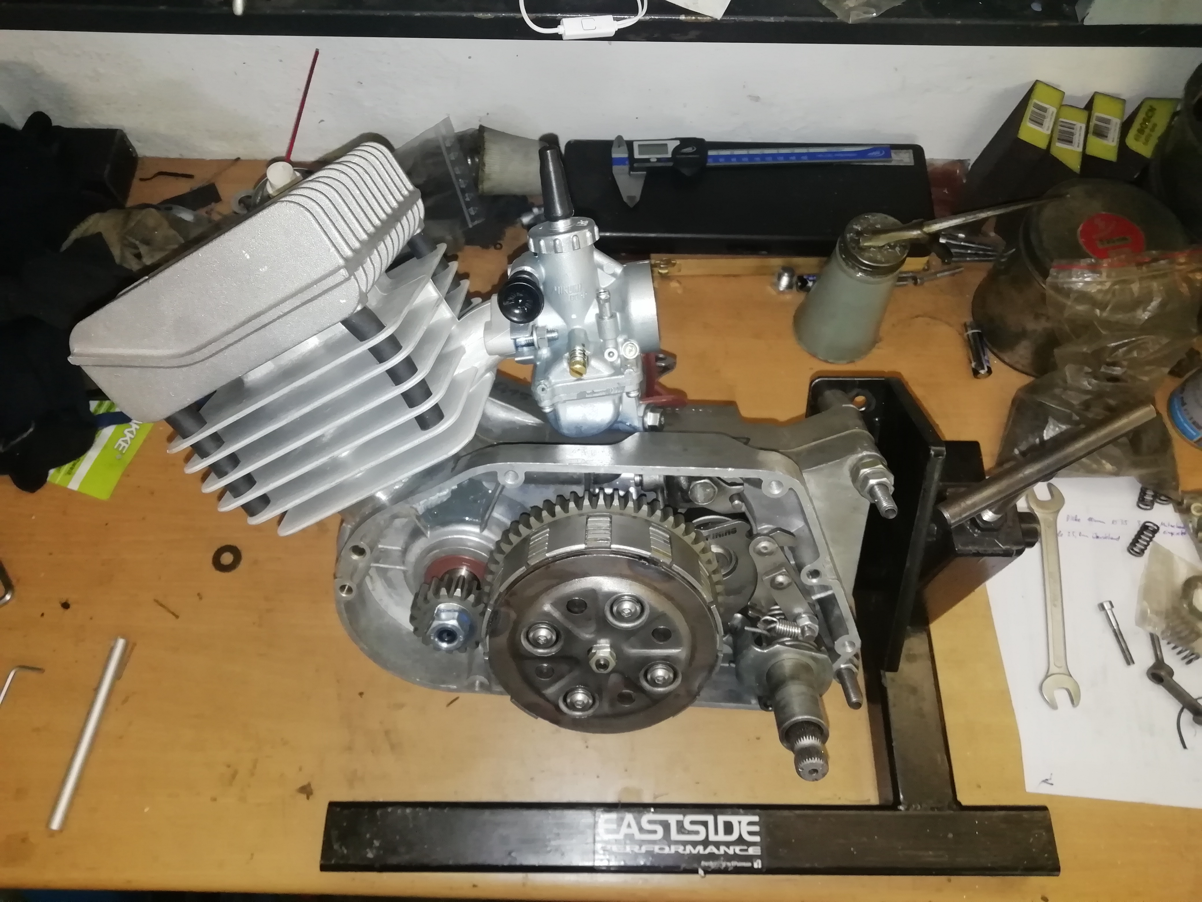 Verbaut ist nun, Bigbore Kbw von LT, ZT 5gang Getriebe mit langem ersten, verschraubter SWB, schwenkhebel von AKF mit 8mm Stift, breites KW Lager, Ronge primär 16:55, immernoch 5Lammellen Kupplung mit 1.6 TF, Vape, Koyo Lager, 28er Polini Vergaser.