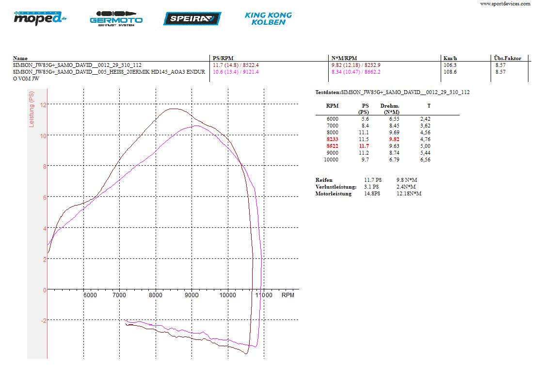 Selbst mit Resos geht der JW G85+Zylinder sehr gut. Anbei die Leistungskurve mit JW AOA3 als Referenz und ein Reso von uns. Der Reso schiebt unten schon brutal an (Wheelie vorprogrammiert) deutlich heftiger als der AOA3, und " das Loch" ist kein Loch, merkst du beim fahren 0.