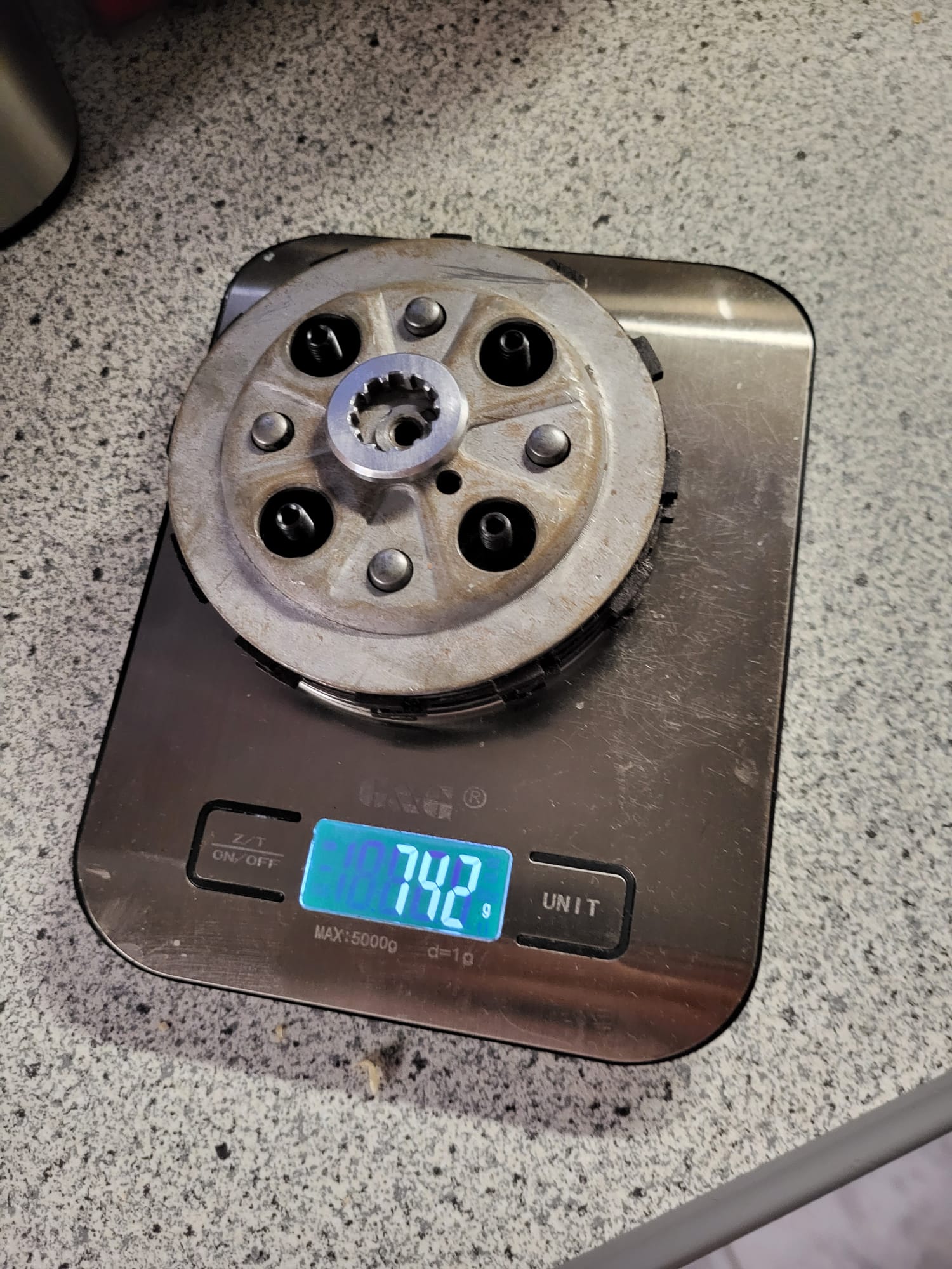 Dabei wiegt die ganze Kupplung unter 800g.Das ist jetzt ein 5 Lamellenpaket mit Originaler Druckplatte und der S51 Mitnehmer.