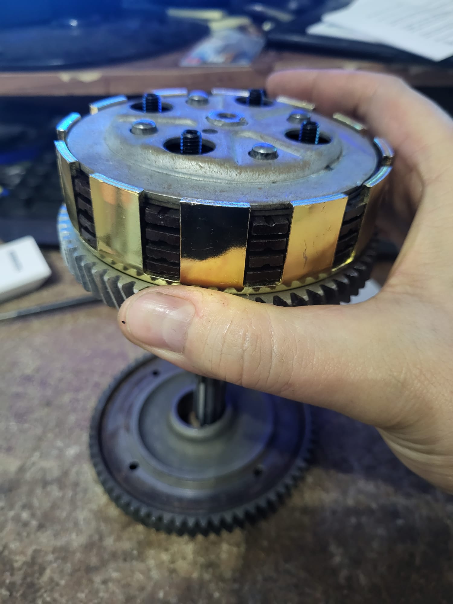 Dazu habe ich ja auch einen Mitnehmer, Stahlscheiben, Druckplatte etc gebaut.So schaut das ganze im Moped aus.