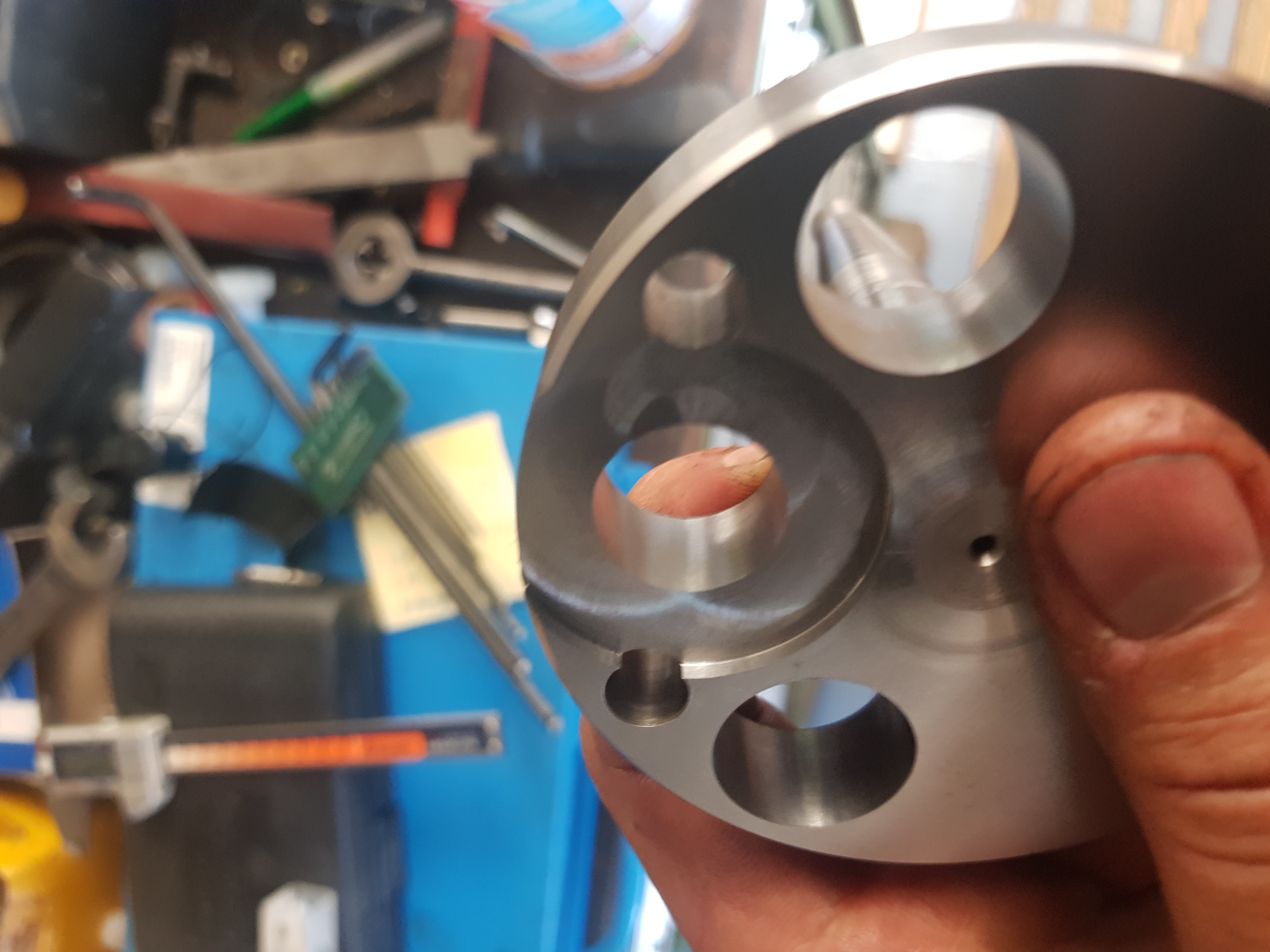 Ich hatte bedenken, dass wir durchbrechen an den Durchgangslöchern für die M6 Schrauben. Glück gehabt, die Kammer ist nicht genau koaxial zum Lagersitz. (deswegen wohl auch die je Seite 1mm Spiel im Gehäuse zur Kw) Die dünnste Stelle ist noch 2mm dick.