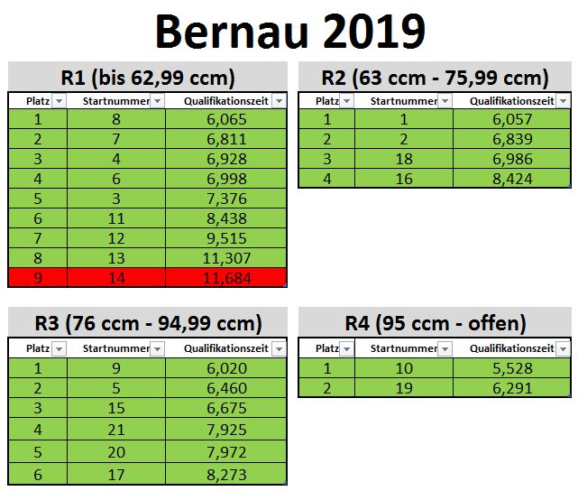 wie versprochen werde ich hier die Qualifikationszeiten der Sprintrennveranstaltungen, die mit der Startanlage von TRT (Tequila Racing Team) durchgeführt wurden, veröffentlichen. Aus Datenschutzgründen werden hier nur die jeweiligen Startnummern und die dazugehörigen Bestzeiten der Qualifikationsrunde gepostet.