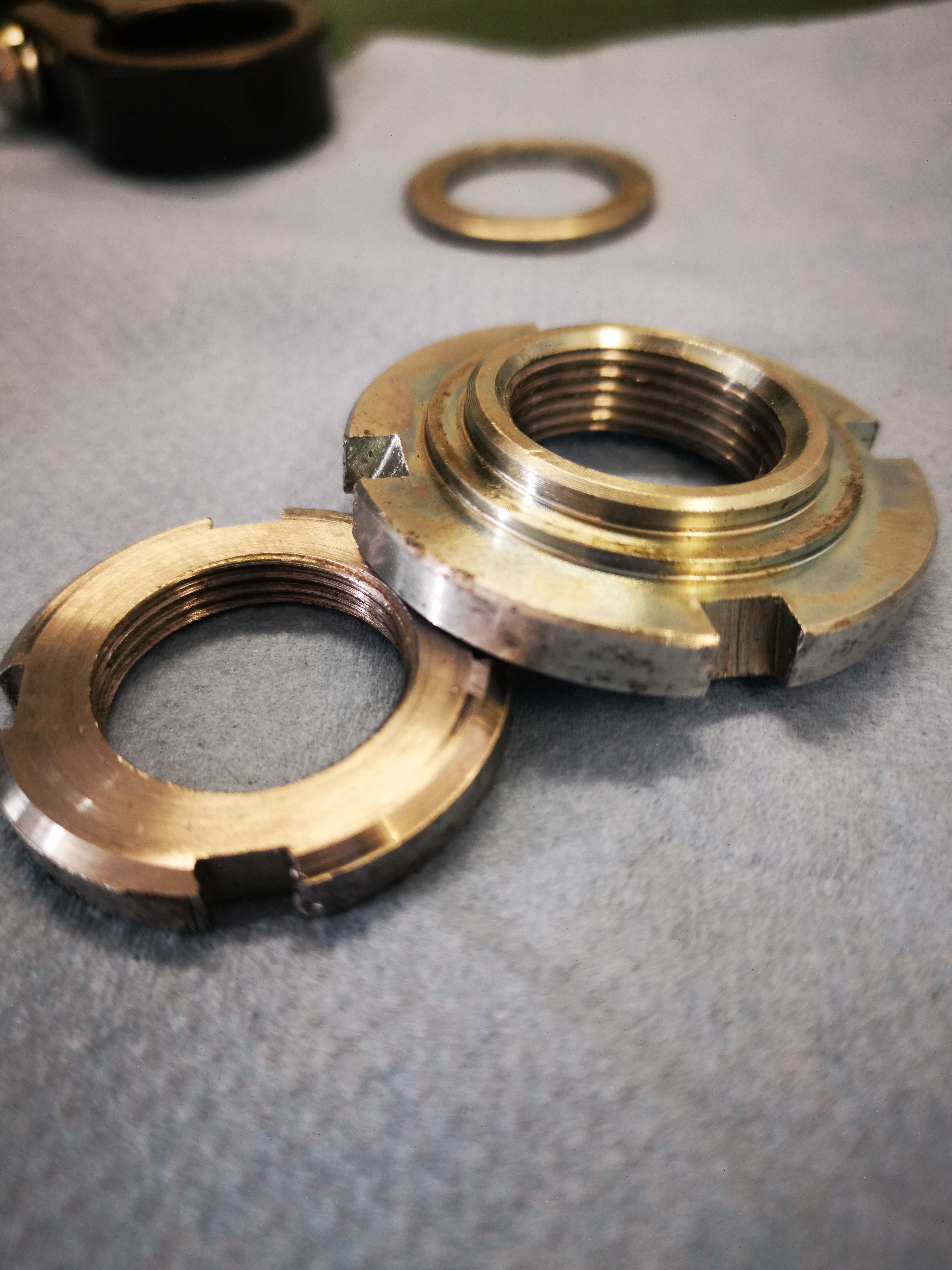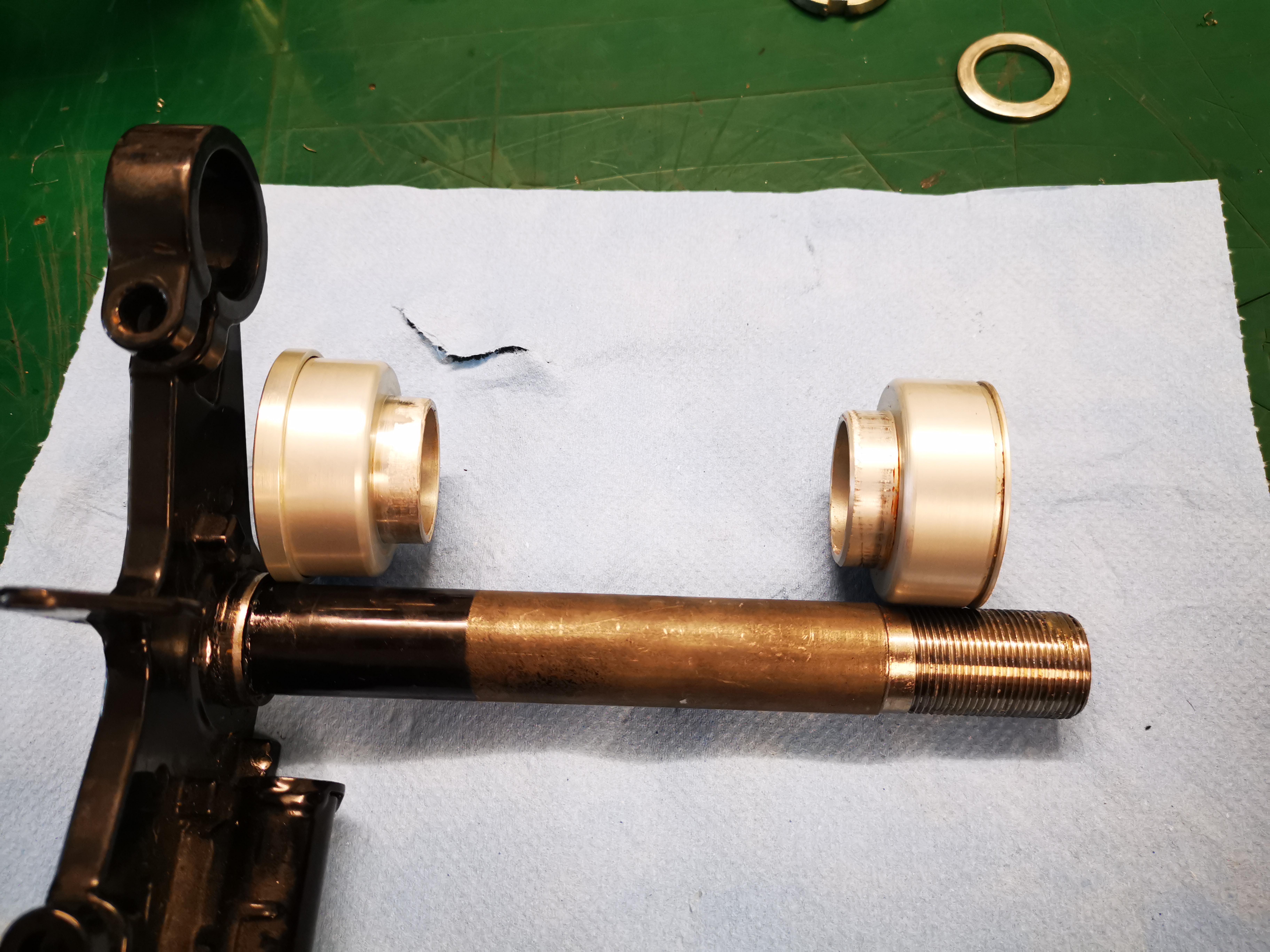 Den Rahmen habe ich vor etwa 1 Jahr zusammen mit einem kompletten Fahrwerk gekauft (derjenige war auch hier im Forum aktiv), der Rahmen wurde am Steuerkopf schon für einen Kegelrollenlagerumbau gekürzt, so muss ich keinen Originalrahmen zerstören.