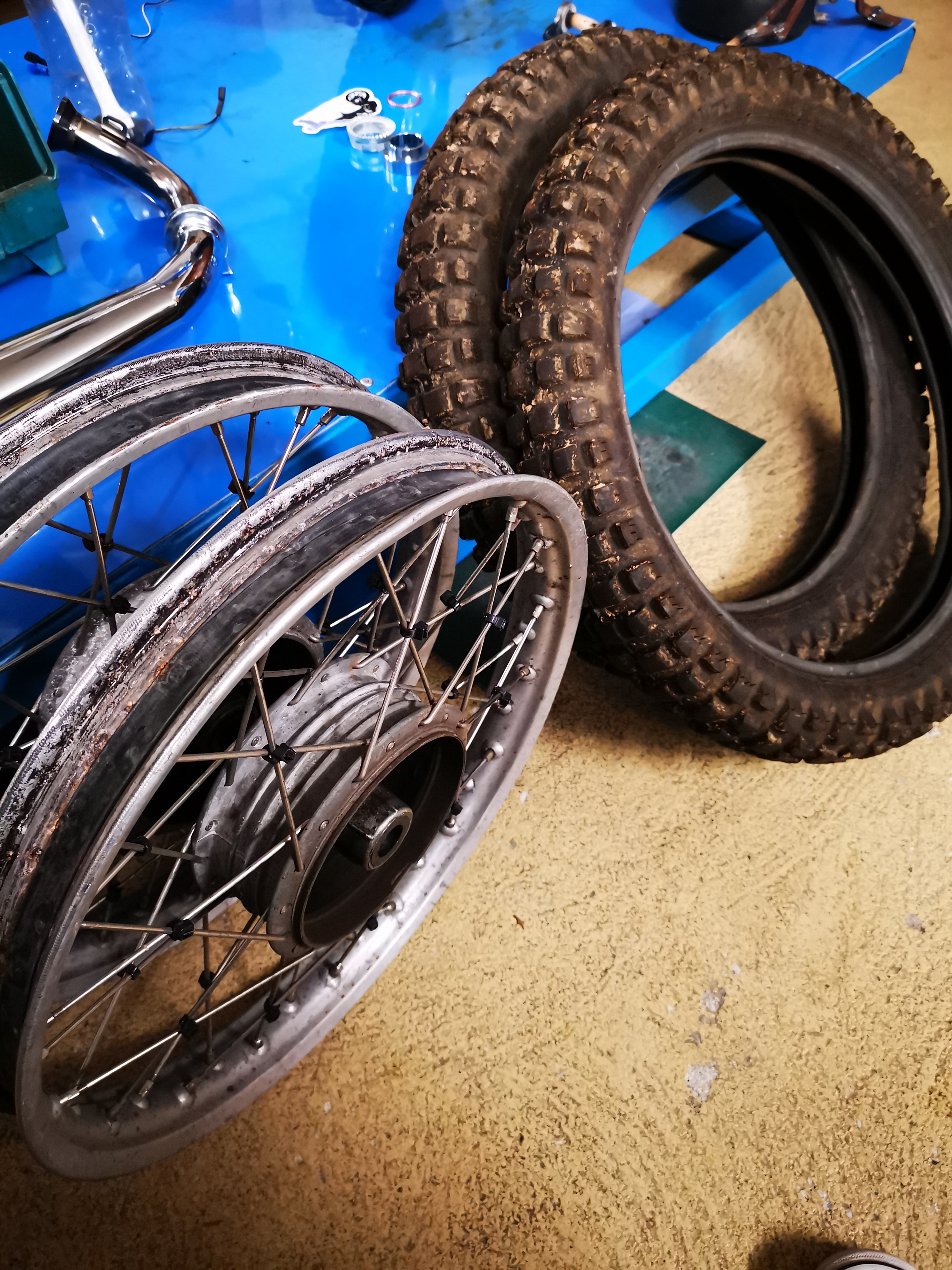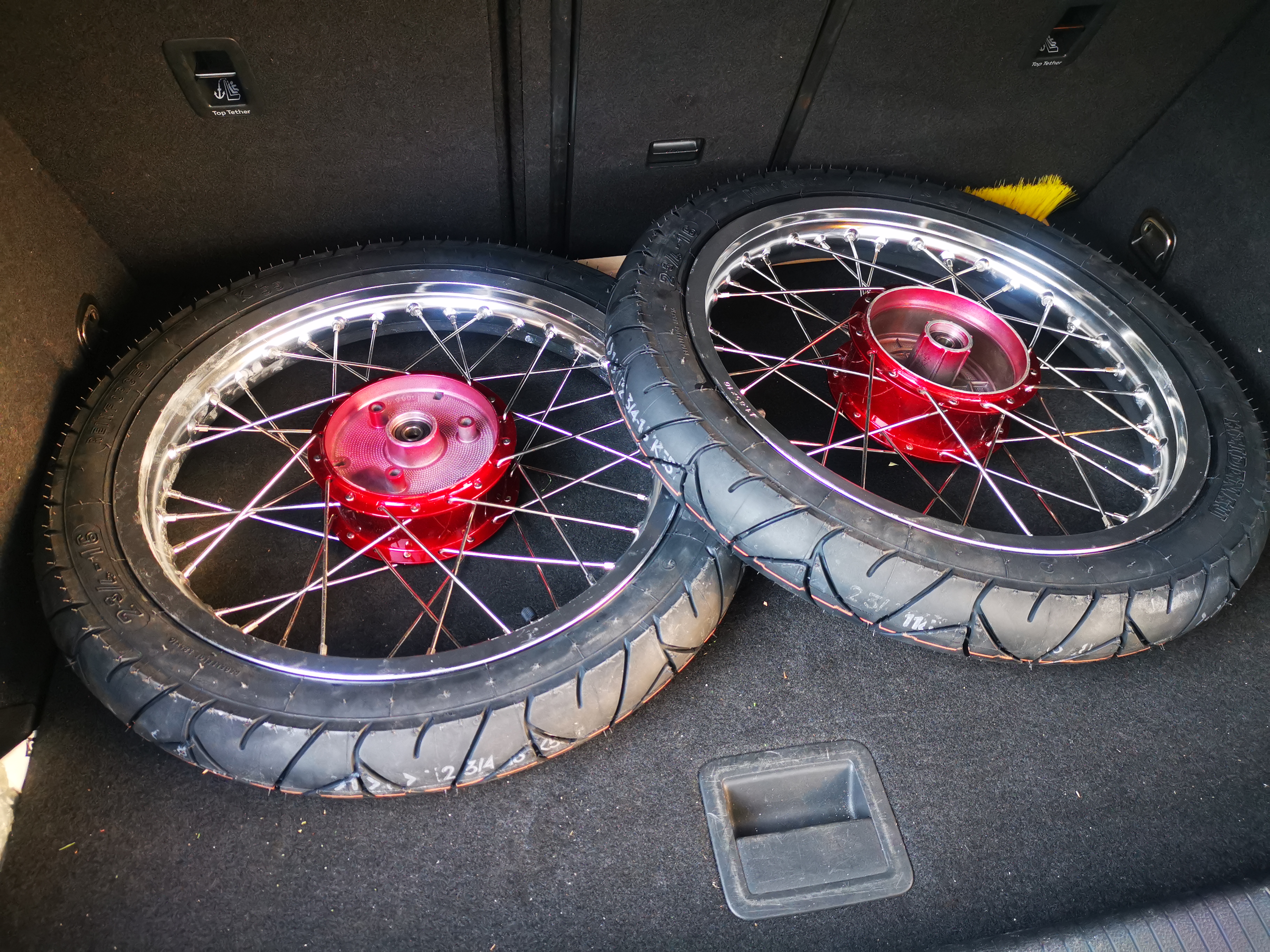 Es stehen 2 Radsätze zur Verfügung, einmal DDR Felgen mit neuen Edelstahlspeichen und Mefo Stonemaster Reifen von KC Racing (Danke nochmal dafür!) und einmal neue MZA Naben, 1,85er Felgenringe, Edelstahlspeichen und K55 Reifen (außer die K55 alles durch Glück geschenkt bekommen). Also einmal für das, was das Moped eigentlich gebaut wird und einmal sollte mich doch die Lust auf bisschen Rennstrecke packen (beim Harzring Treffen ist mir die Idee gekommen).