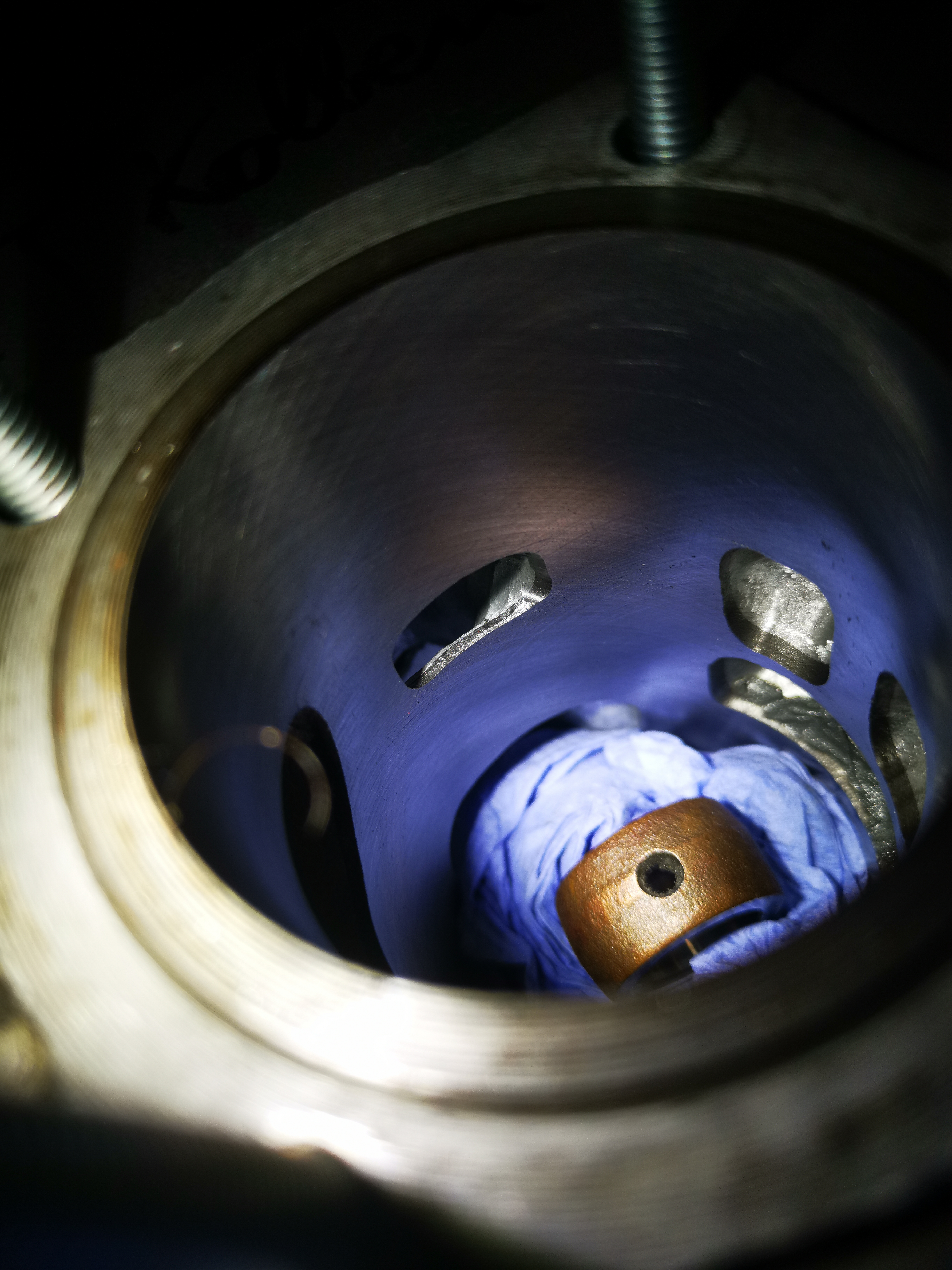 Motor ist aus rumliegenden Teilen zusammengesteckt worden. DDR Gehäuse, wo 2 Lagersitze nichtmehr so hübsch sind, Gespindelt auf 55mm und an den Überströmertaschen geklebt, DDR 4 Gang, ZT BB Kurbelwelle (habe ich unbenutzt geschenkt bekommen), MZA S70 Primär, 5 Lamellen Kupplung mit normaler Druckplatte und ein 85er Prototyp Zylinder (auf dem Bild war der Zylinder noch nicht fertig bearbeitet) , bei dem ich einfach mal was ausprobieren wollte. Alle Simmerringe sind neu, aber von verschiedenen Herstellern (2 NJK Viton, 1 Blauer und sogar 1 schwarzer). An dem Zylinders sitzt ein China BVF 21n1-11 und der Vergaserstehbolzen wurde geklebt, da dieser ausgebrochen ist. Also ziemlich zusammengeschustert das Ding.