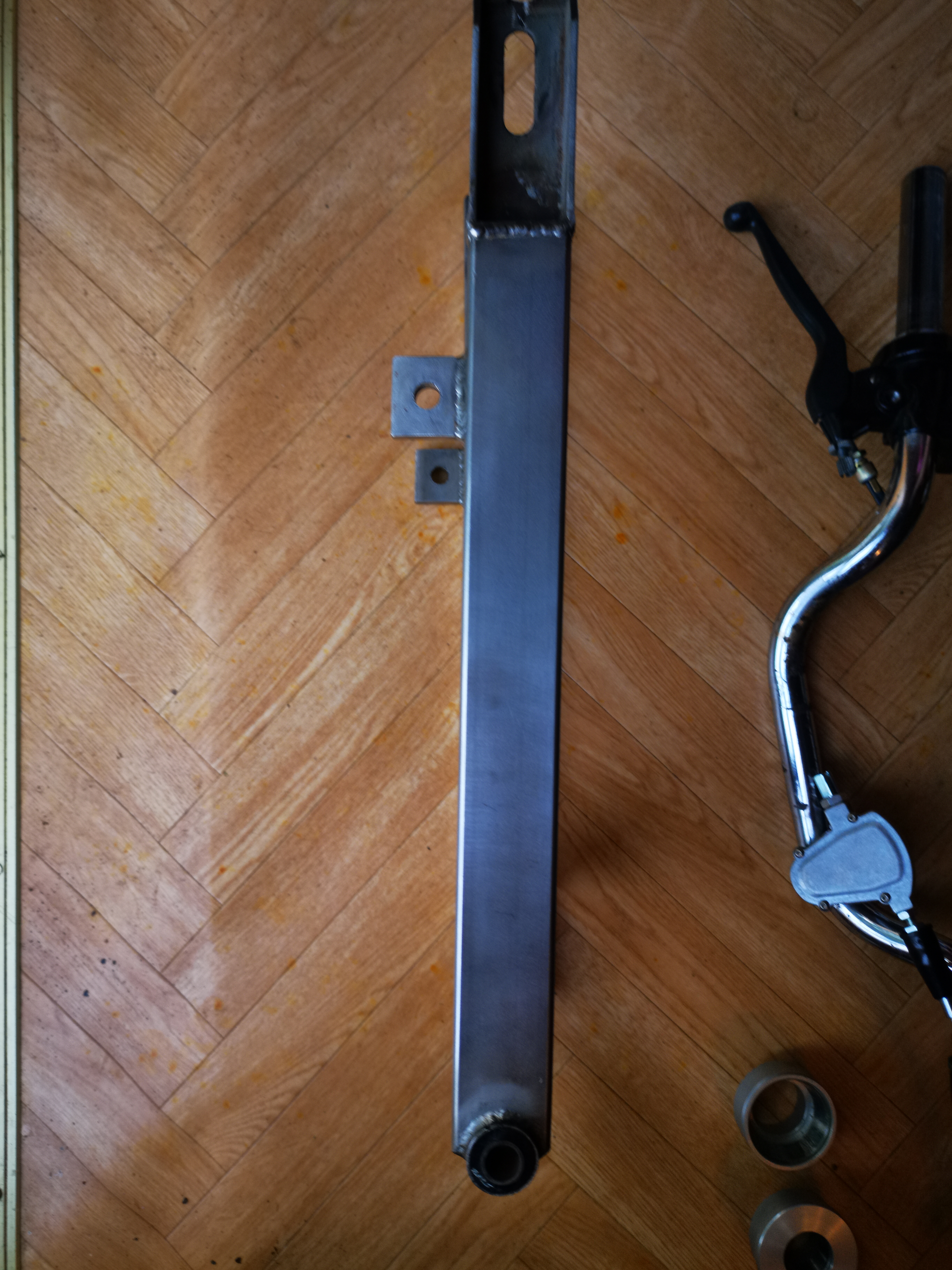 Die Schwinge ist offensichtlich eine Kastenschwinge, diese besteht aus Edelstahl und war eigentlich anderweitig verplant, aber da mir die allgemeine Qualität nicht so gefällt wird sie eben im Crossmoped bis zur Zerstörung gefahren. (für das andere habe ich eine von WigNick gekauft, die ist qualitativ absolut perfekt)