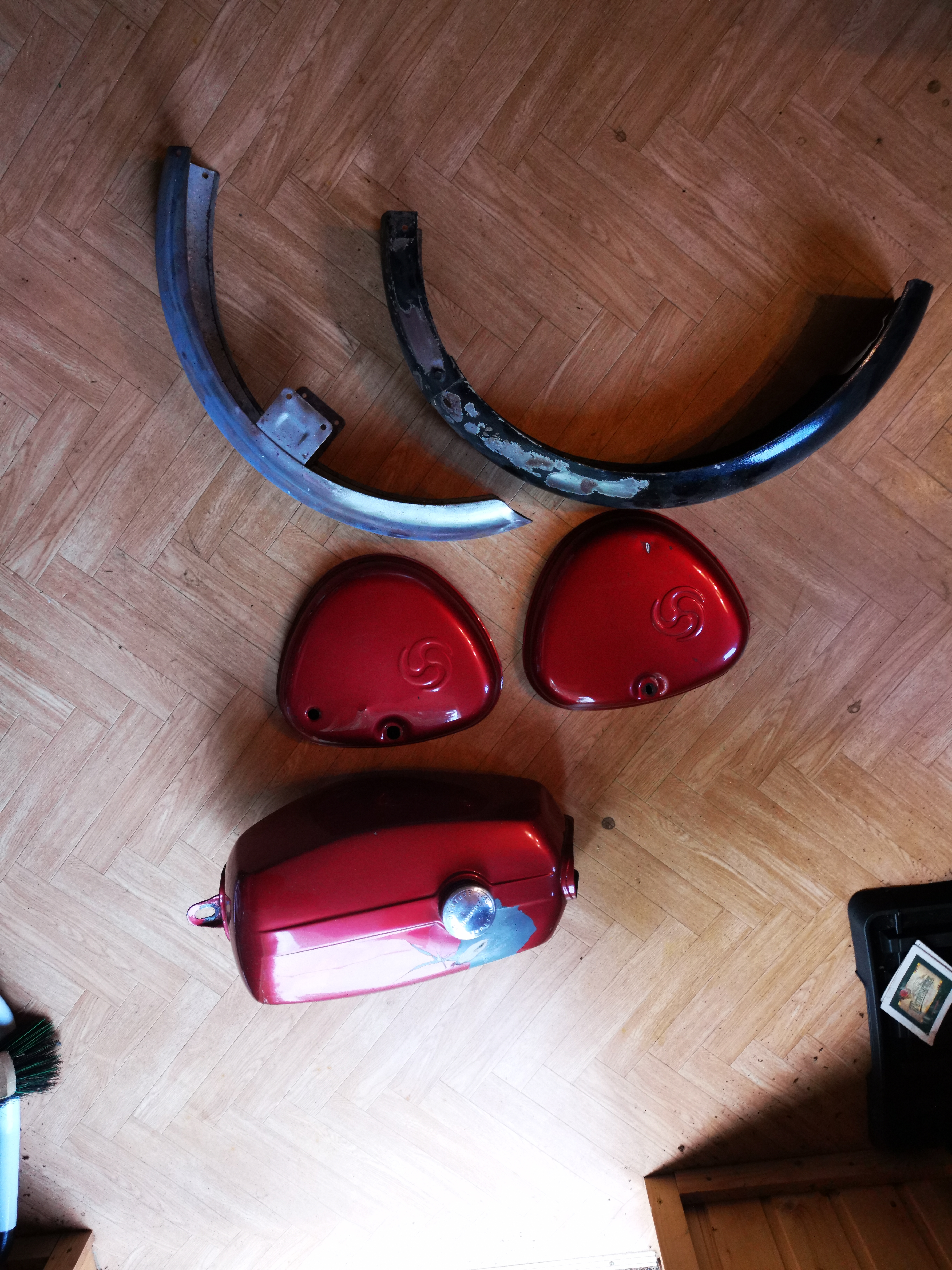 Die Idee kam vor einiger Zeit, da ich bei gewissen Treffen Angst um mein gutes Moped hatte und ich gerne mal Cross ausprobieren will, so wurde also als erstes mal ein Überblick verschafft, was ich so alles an Teilen da habe.